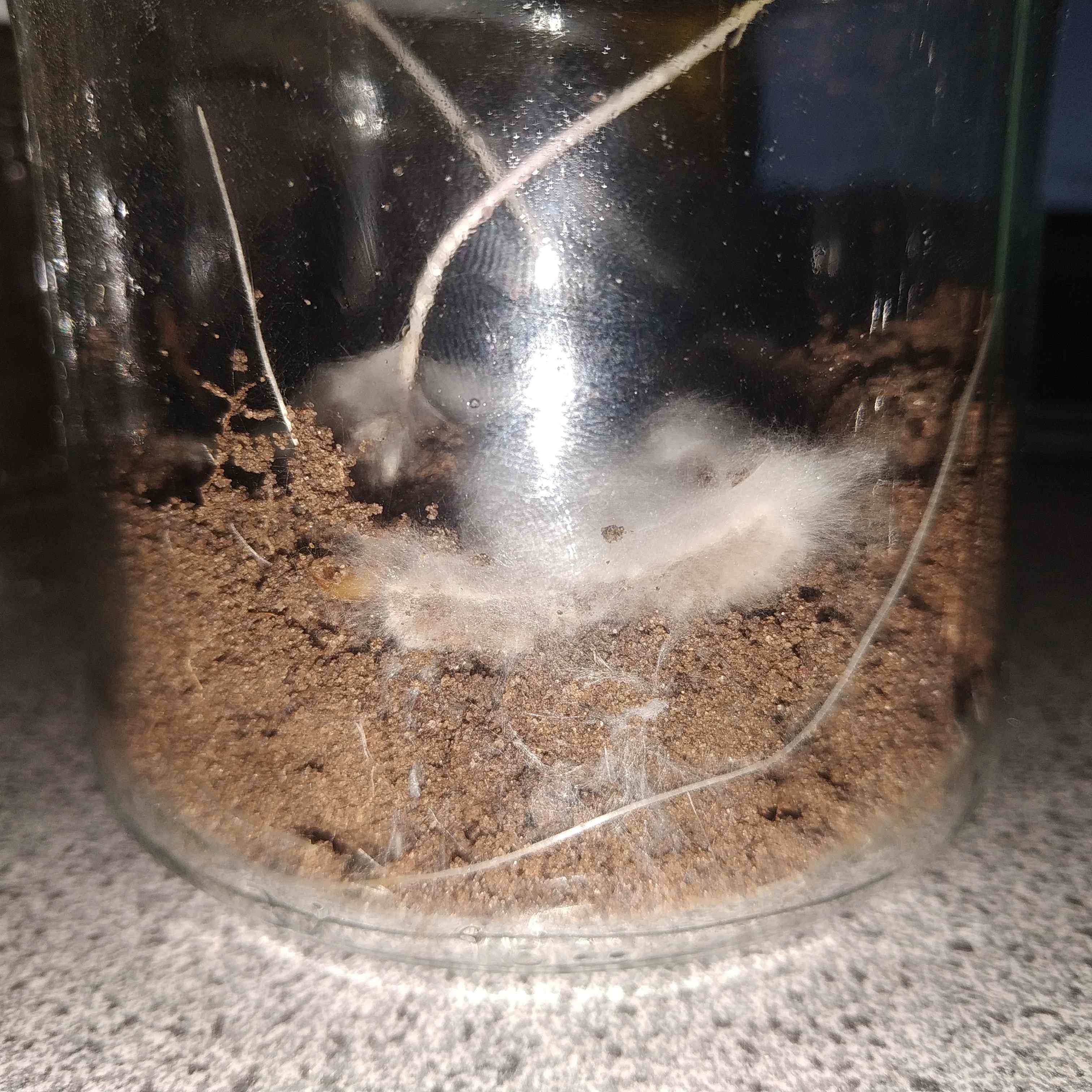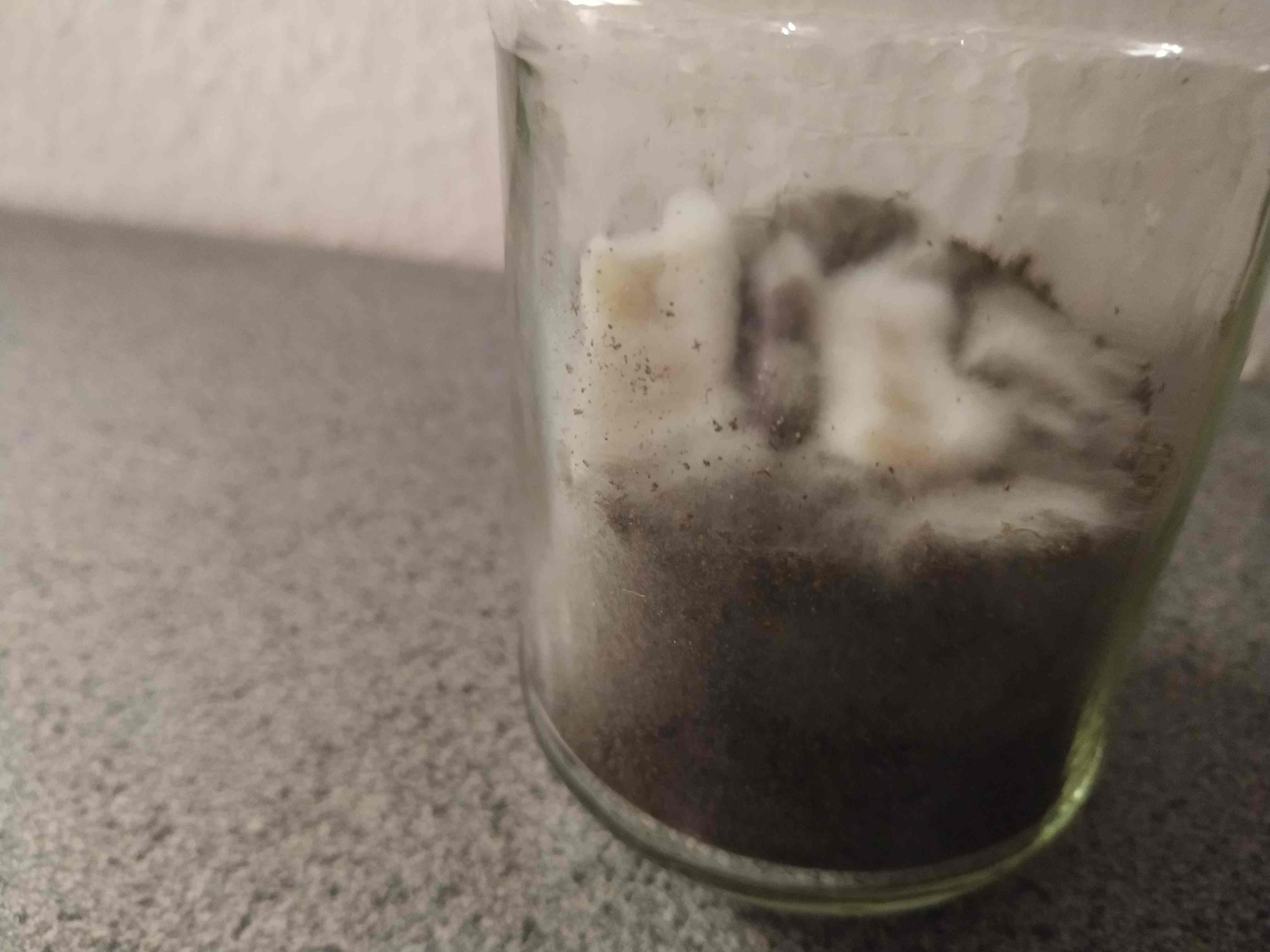 Es kann sich also tatsächlich Myzel/Hyphen ausgehend von dem Agar Stückchen weiter in den Boden vorarbeiten. Natürlich muss man mal abwarten wie sich das alles entwickelt, vielleicht bricht der NS ja morgen zusammen und nächste Woche ist kein Myzel mehr zu erkennen. Glaub ich aber nicht.