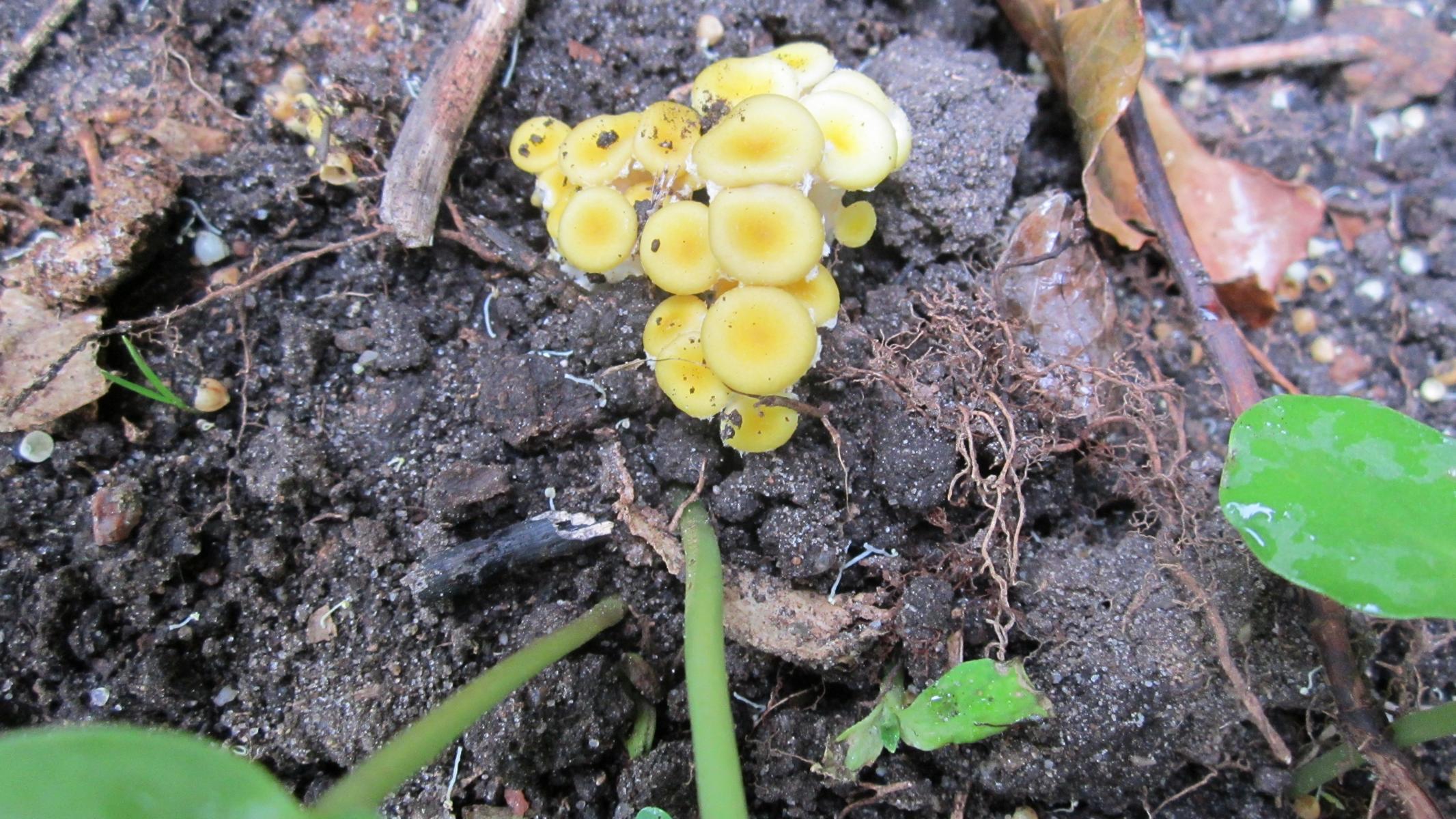 Hier mal Bilder von ca 0,2 l Zitronenseitlingsubstrat bestehend aus körnerbrut und kaffesatz, dass ich vor ca. 1 1/2 Monaten im Garten vergraben habe und dafür erstaunlich viele Fruchtkörper bildet. Es gibt noch 2 weitere kleine Kluster. Bin mal gespannt ob die auch einigermaßen groß werden solange die Schnecken nicht schneller sind.