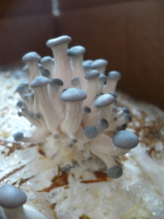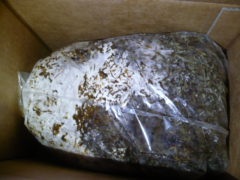 Zur weiteren Vorgehensweise bin ich ratlos. Vielleicht könnte man den von der Auster besiedelten Bereich herausnehmen, säubern, in einen kleineren Beutel übertragen und fruchten lassen, aber sobald da nur ein wenig vom Schleimpilz mitkommt, wird es bald wieder von vorne losgehen. Falls ein Garten zur Hand ist, würde ich das Austernmycel an einer feuchten und schattigen Stelle vergraben, mit ein paar cm Erde bedecken und den unbesiedelten Rest samt Schleimer auf dem Kompost entsorgen.