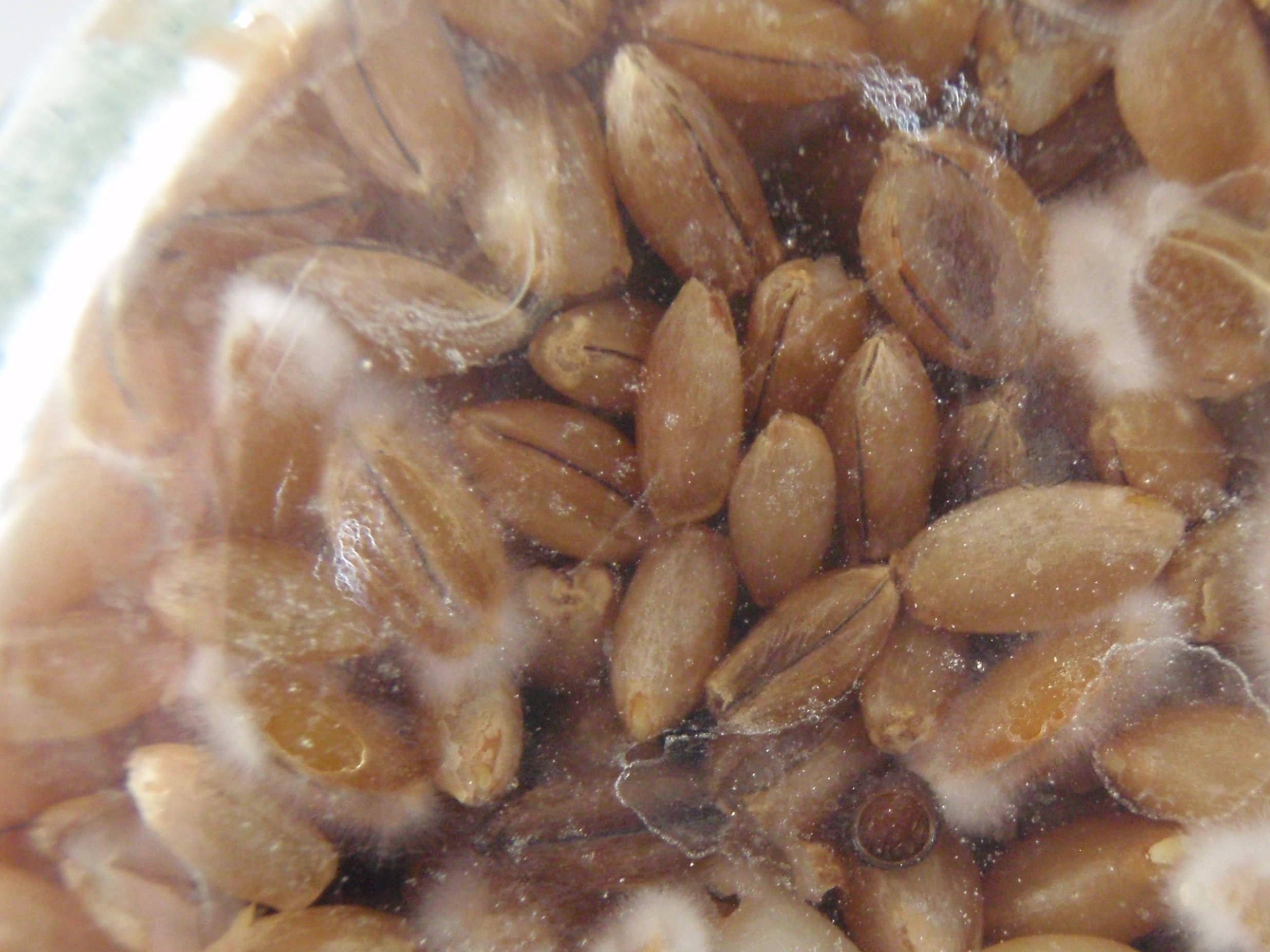 Je nach Wachstumsbedingungen wirken die Körner nach einiger Zeit matschig und riechen müßtest du es spätestens dann auch, dass da Bakterien am Werke sind.