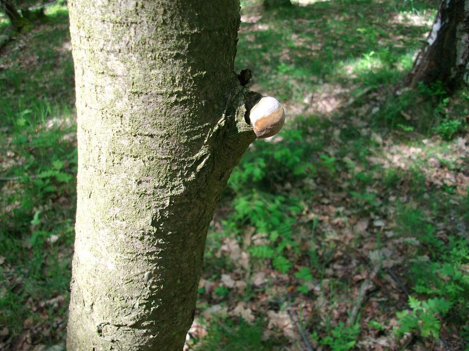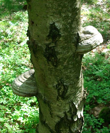 Auffällig ist, dass in diesem relativ kleinen Wald sehr viele Bäume von solchen Baumpilzen besiedelt und dass die Bäume (siehe Bild) eigentlich noch recht jung sind. Alle Aufnahmen stammen aus dem gleichen Wald in kurzer Entfernung zueinander.