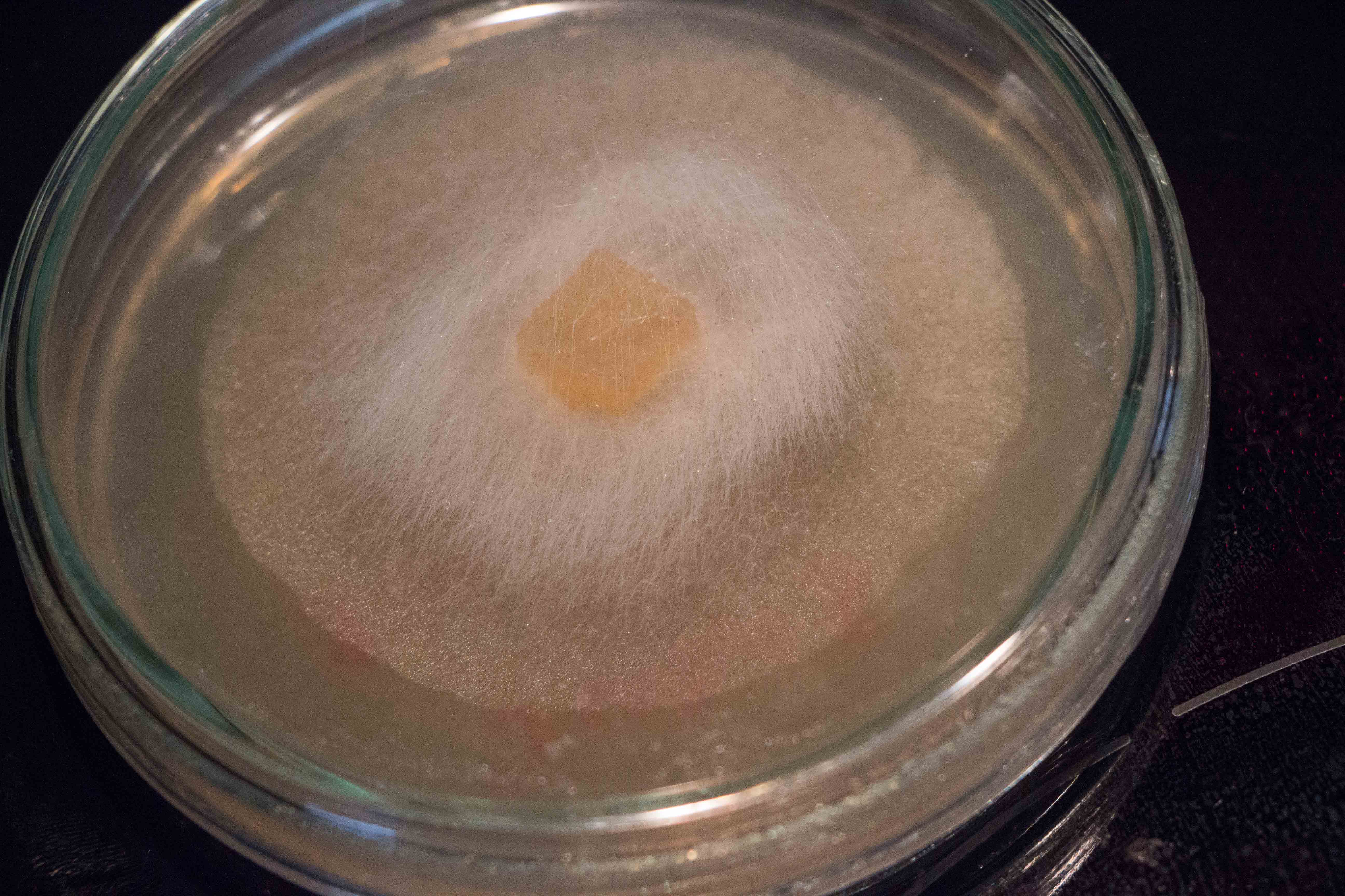 Zur besseren Erklärung: Das Mycel wächst erst dicht am Agar (MEA) gedrängt und bildet dann diesen Mycelflaum von der Mitte her ausgehend. Das Stück in der Schalenmitte ist das überimpfte Teil.