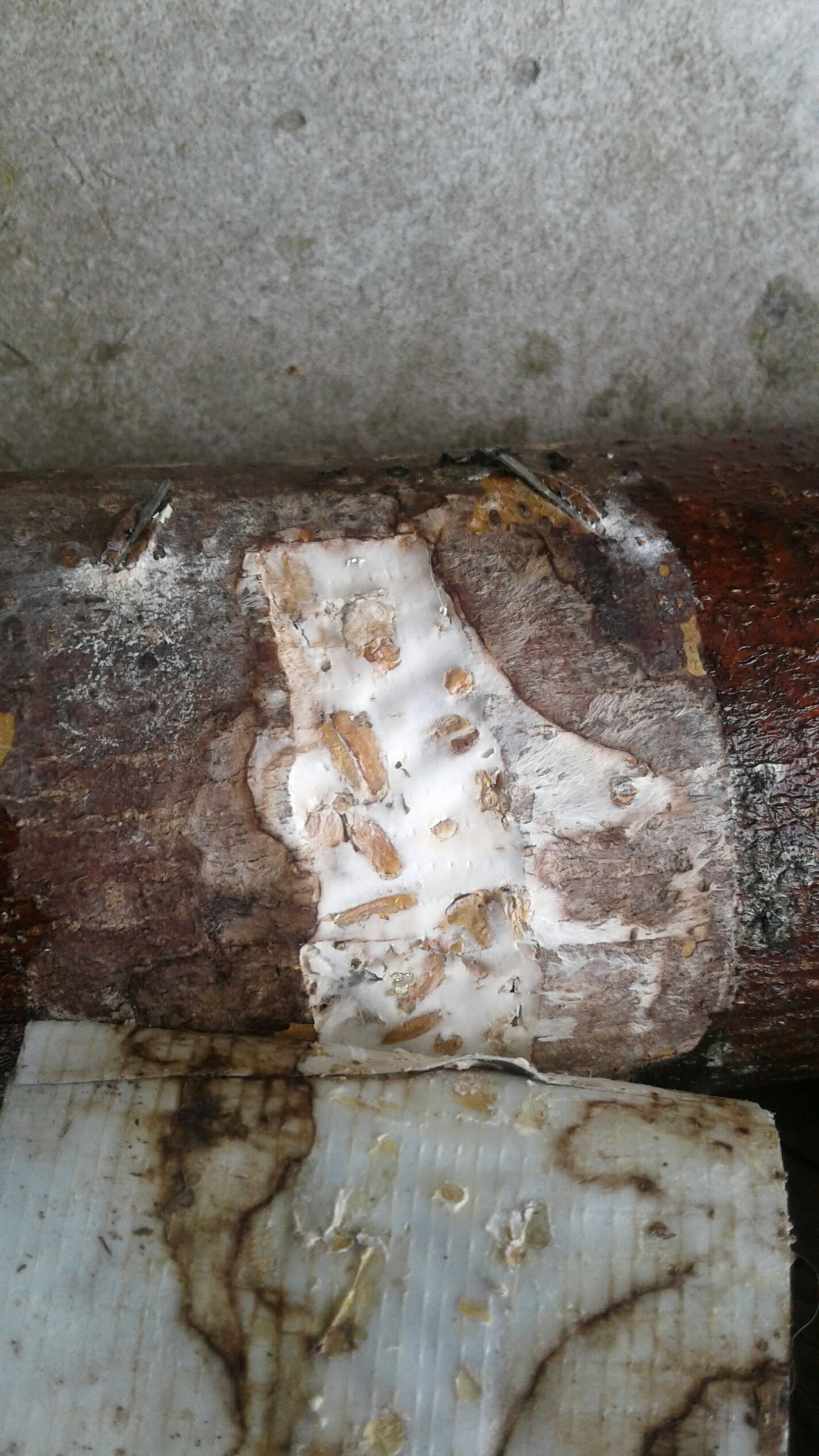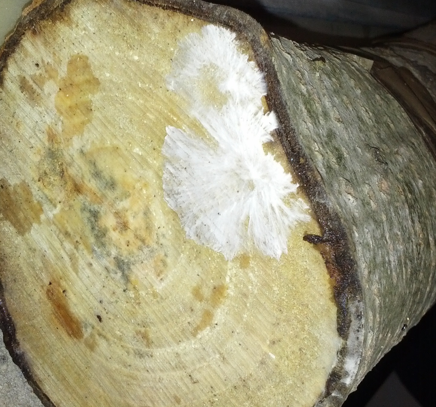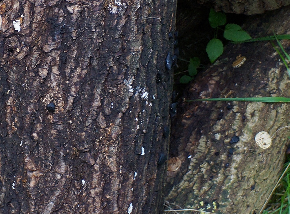 Zunächst dachte ich: Joa, da sieht man schön wo ich die Löcher gebohrt habe, da das Mycel ja erst einmal längs zur Faserrichtung wächst oder? und die folgenden Bilder zeigen Pilze die dort jetzt wachsen. Ich finde sie sehen eher aus wie der Lackporling als der Shiitake. Vielleicht auch was ganz anderes. Die Stämme sind leider auch von einem schwarzen Pilz besiedelt. und hier der schwarze Pilz, leider nur ein schlechtes Bild: Wenn da jetzt doch noch Shiitake wachsen sollten, ist das dann schlimm, dass der schwarze Pilz da auch im Holz wächst?