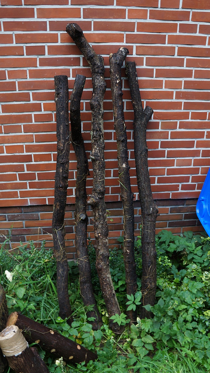Da ich bei der ersten Beimpfung noch nicht wusste, dass ich da so viel Spaß dran entwickeln würde und auch noch keinen Schnellkochtopf besaß, musste ich ein weiteres Mal Shiitake-Körnerbrut bestellen. Ich hab die Brut dann vermehrt und eingelagert, sowie einige Eichenknüppel beimpft. Das sieht auch ganz gut aus bisher. Ich habe hier 10mm-Löcher gebohrt, Körnerbrut rein und mit Buchen-Dübeln ausm Baumarkt das Loch verschlossen und das überstehende abgesägt. Hierin besteht jetzt meine Shiitake-Hoffnung und mal sehen was aus den dicken Dingern wird.