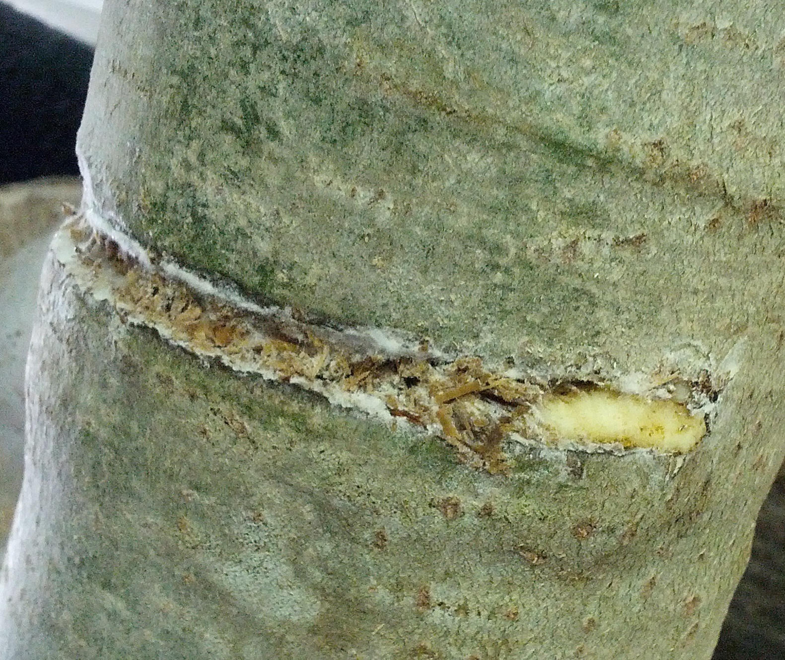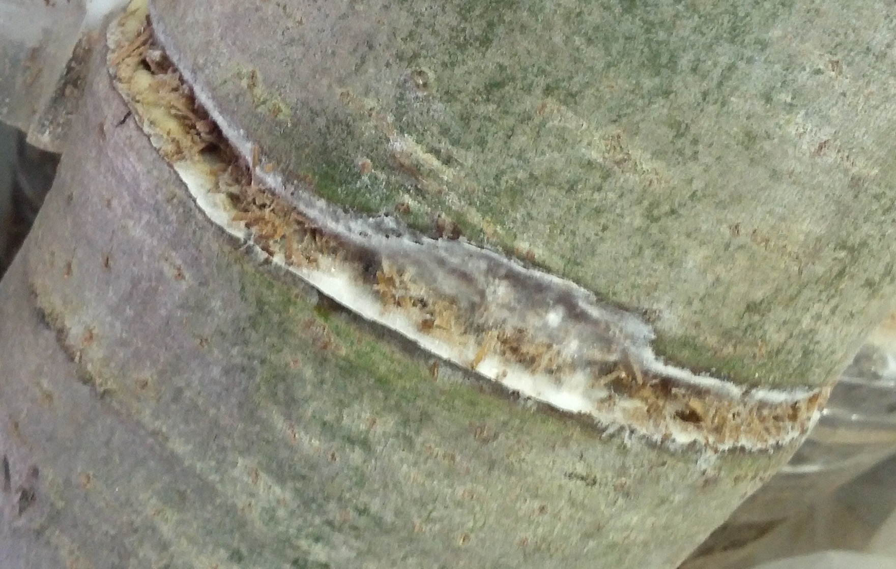 Was ist das für ein Pilz, der da so braun mit weißem Rand wächst? Bzw. kann das Shiitake sein?