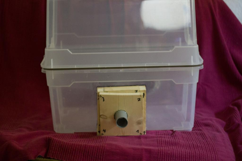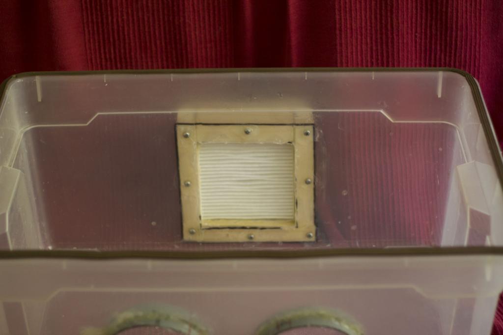 Werkzeuge, desinfektionsmittel und pilzzeug reinstellen. Deckel drauf! Staubsauger anschliessen und mit blasfunktion anmachen. Saugen geht nicht mit diesem aufbau! Haende desinfizieren und durch die oeffung fuehren. Von innen alles desinfizieren. Dann die arbeiten erledigen die steril sein muessen.
