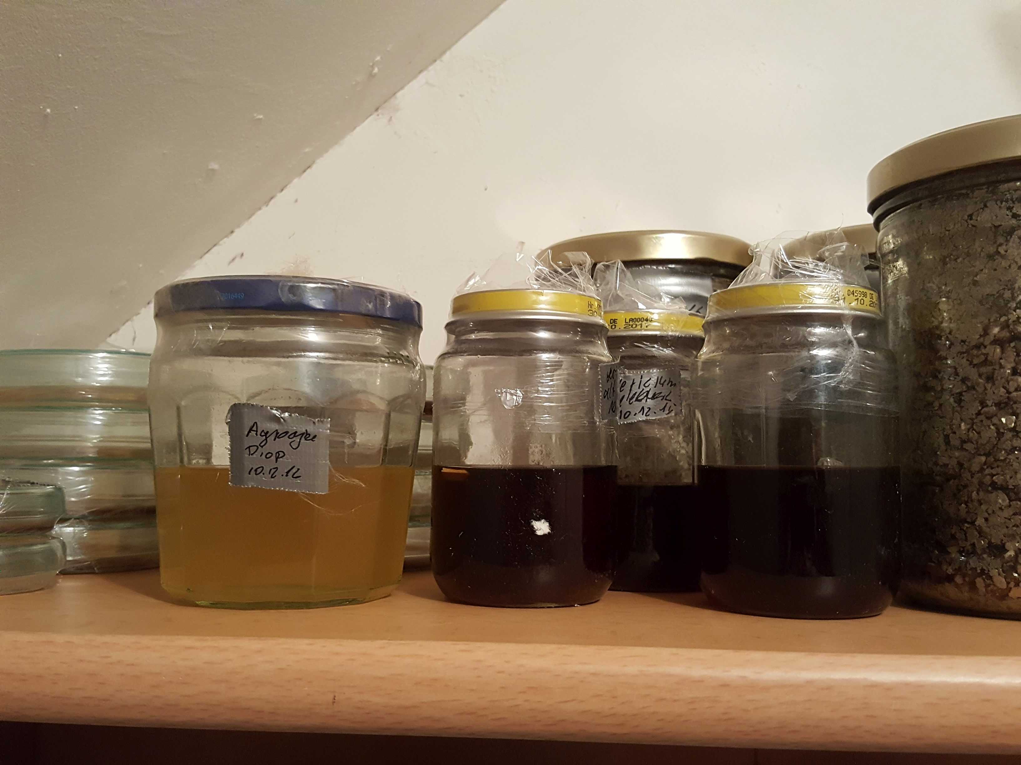 Im Roggen geht es allerdings gaaaaanz gemütlich zu Werke. Während beim Pioppino Flümy gerade mal zu erkennen war, dass es anfängt auszutreiben, war beim Hericium bereits eine Qualle die die halbe Flüssigkeit ausfüllte. Wegen der dunklen Malzbier-Honig Nährlösung ist auf den Foto's nichts zu erkennen, daher hab ich erst gar keins hochgeladen.
