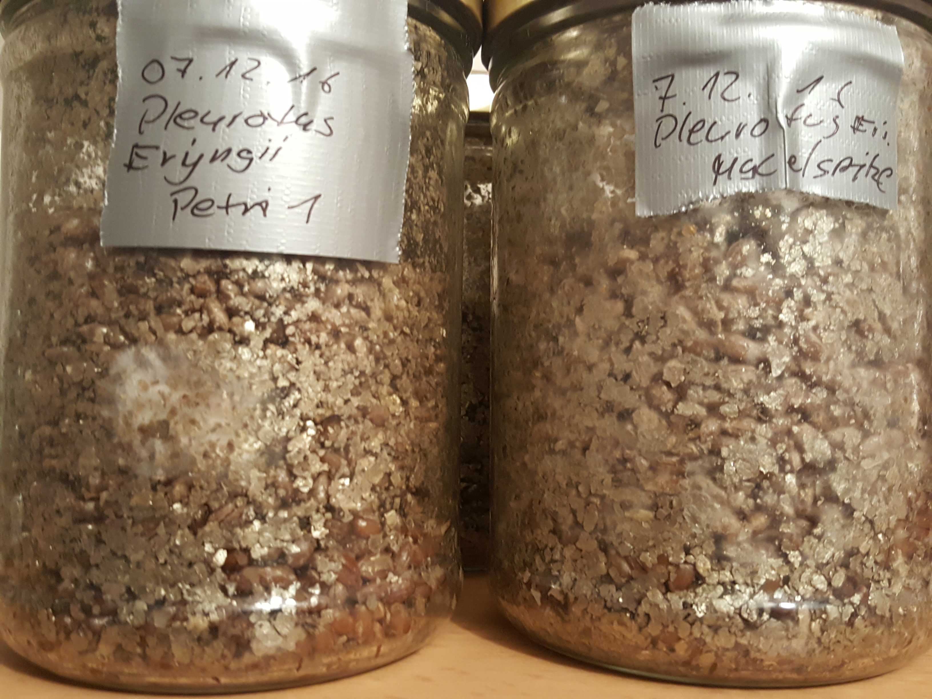 Während die mit Agar beimpfte Brut punktuell stark einwächst (was logisch ist), verbreitet sich die Mycelbrut gleichmäßig, aber feiner, im ganzen Glas.