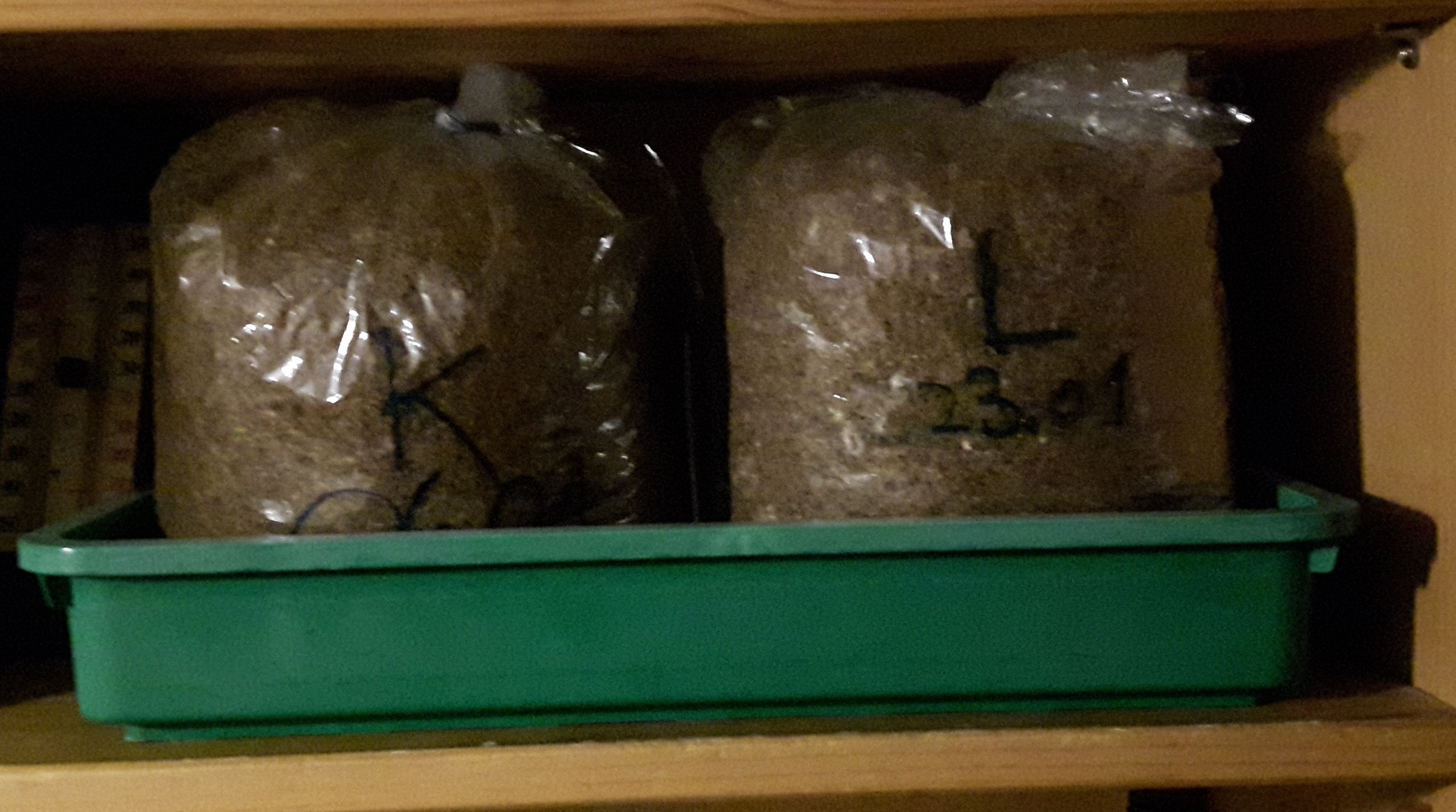 Jetzt sind es bereits 2 Beutel, die Durchwachsen können. Lungenseitling und Kräuterseitling. Beide mit Strohpellets, 10% Kaffeeresten und etwas Gips. Der Beutel rechts ist 3 Tage älter, es zeigen sich bereits weiße Stellen. Die Beutel stehen in der Nähe unseres Holzofens. Tagsüber bis 25°C., nachts 14-17°C. Mal sehen, wie es die Situation annimmt. Gelöchert sind sie auch. Jetzt heißt es warten, nicht meine Stärke.