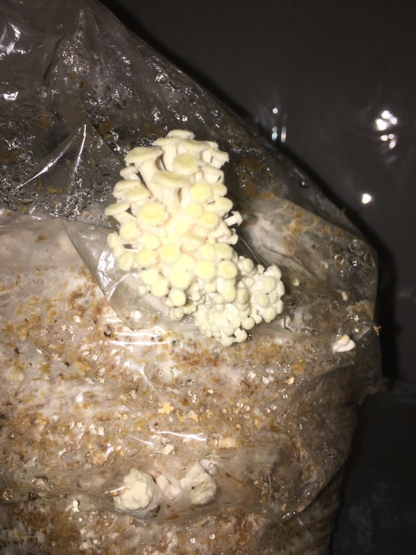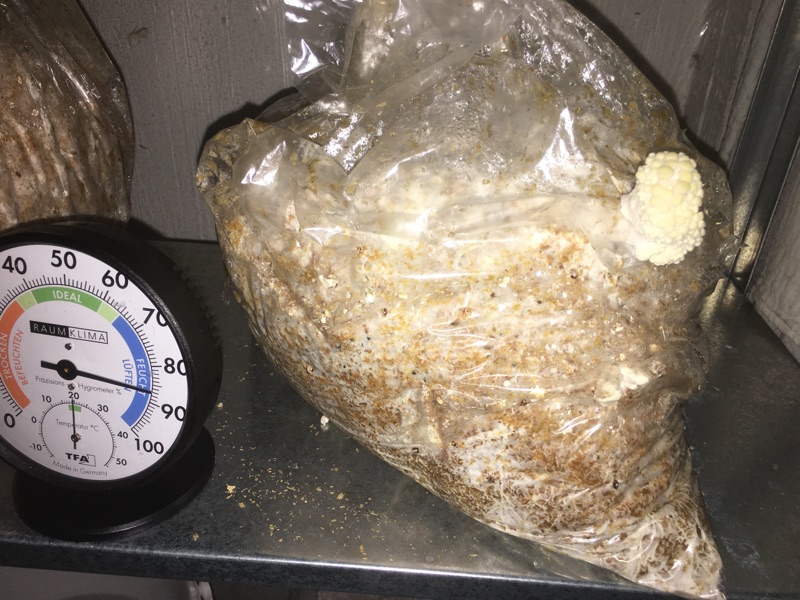Ich bin so richtig happy. Nach 2 (!) Wochen, nachdem ich die beiden Substratsäcke geimpft habe, haben sich die ersten Primos gebildet. Ich bin absolut erstaunt mit welcher Geschwindigkeit das Myzel die Substrate besiedelt hat. Und jetzt fruchten diese sogar schon. Meine erste Zitronenseitlinge. Ich bin gespannt, ob das Licht und der Luftanteil ausreichend sind.