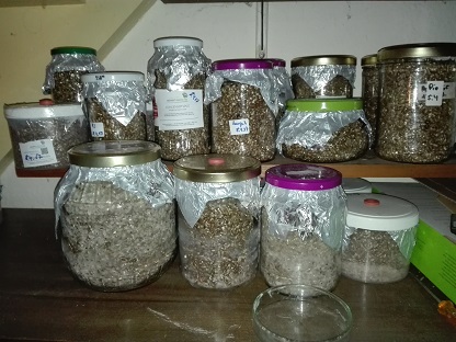 Ich nehme 2kg Roggen die ich einen 5L Eimer gebe und dann mit LAuwarmen Wasser begiesse. Das ganze lasse ich 18 Stunden +/- 1St. Quellen. Dann schütte ich das korn in einen zweiten im Boden gelöcherten Eimer und lass diesen Schräg hängen zum abtropfen. Ist dieses fertig, soweit abgetropft fülle ich das Korn in einen 10L Eimer und mache den Deckel drauf. Dann nehme ich 2L Vermiculit machen diesen in den gelöcherten Eimer und stelle diesen in einen gleichgroßen Eimer und begiesse das Vermiculit bis das Wasser in den zweiten Eimer tropft. Dann nehme ich den Vermiculit gefüllten Eimer und drücke mit der HAnd ( Einmalhandschuh) das Wasser raus bis es nicht mehr tropft. Ab in den 10L Eimer und 15g Gibs dazu. Alles gut durchmischen ( Einmalhandschuh) und in Glässern abfüllen, Alufolie darüber und Deckel darauf in dem ein Öffnung ist so das ich mit einer Kanüle beimpfen kann. Die Öffnung beklebe ich mit Micropore( Medizinisches Vliespflaster). Anschliessend kommt alles in den Autoklav/ Schnellkochtopf für ca. ein und ne halbe Stunde. Den Topf lasse ich danach normal abkühlen und meine Brut ist fertig zum beimpfen. Ich bin der Meinung das KOrn zu KOchen ist nicht meine Lösung;-) und bisher keine KOntis