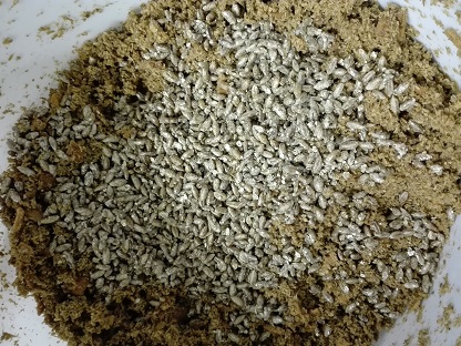 Ich häng Ihn meist schräg Irgendwo hin. Ist es abgetropft schütte ich den Roggen in einen 10L Eimer um und stülpe den gelöcherten Eimer (5L) in einen ganzen 5 Litereimer. Dann schütte ich das Vermiculite in den gelöcherten und begieße es mit einem Brausestrahl Wasser bis es in den ganzen Eimer durchtropft. Anschließend drücke ich das Vermiculite fest in dem Eimer bis es nicht mehr Tropft. Zum Schluss mische ich alles zusammen in dem vorher erwähnten 10L Eimer. Also Gips, Vermiculite und den Roggen.