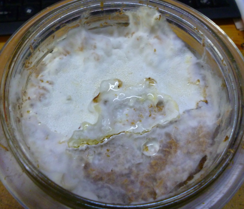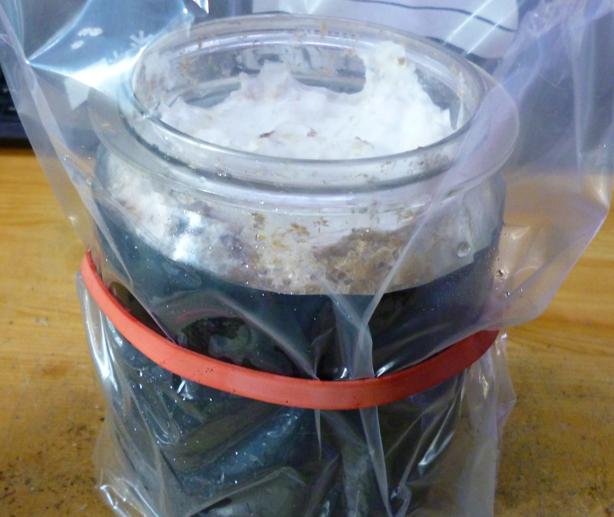 Heute nehm ich den "Deckel" ab und siehe da: Das Substrat ist komplett von weißem Mycel durchwachsen. Oben 2 dunkele Stellen, die aber überwachsen wurden. Das riecht sehr angenehm, ähnlich wie Champignons.