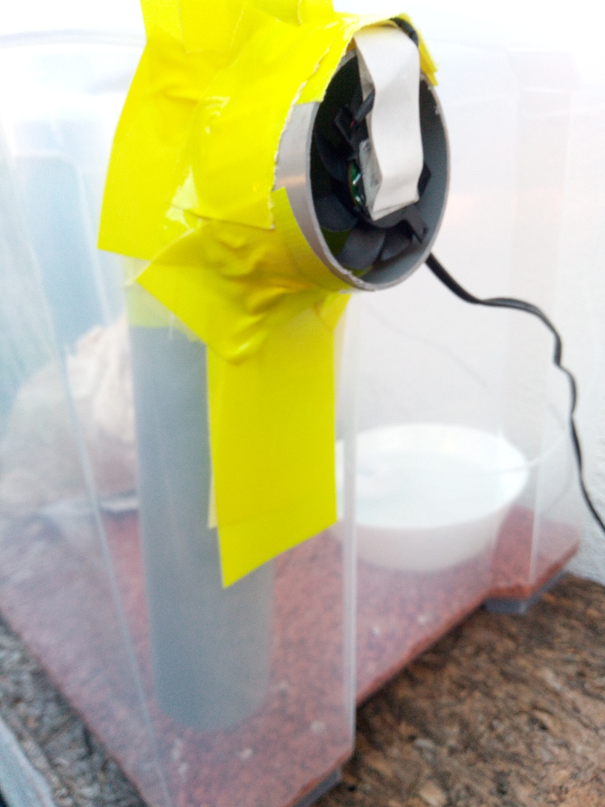 Zutaten: ein altes Abflussrohr, ein alter Lüfter und jede Menge Klebeband, um den Gehrungsspalt abzudichten. Im Rohr ist übrigens Filterwatte fürs Aquarium eigentlich