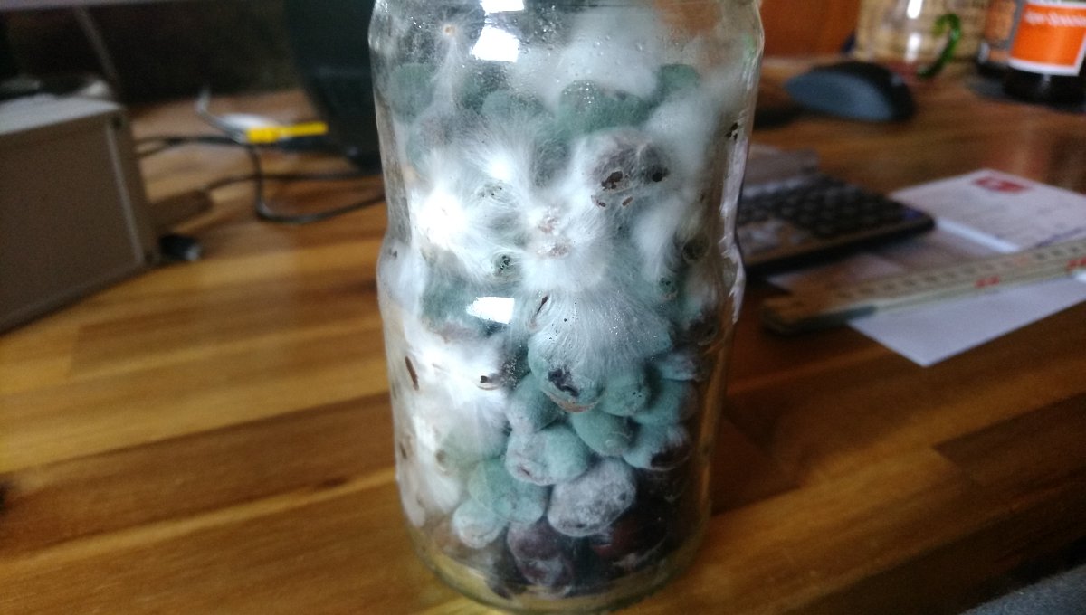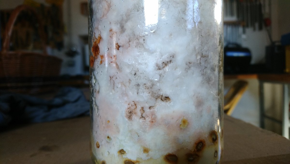 Ein Problem das ich hatte was das Wasser bei den Leguminosen. Nach dem Sterilisieren sah es ganz gut aus. Nachdem ich beimpft und geschüttelt hatte, war auf einmal ein jede Mene Flüssigkeit im Glas. Mittlerweile hat sich das normalisiert. Evtl. lag es auch an der niedrigen Temperatur von 1 bis 2 °C beim Beimpfen. Könnte mir vorstellen, dass durch das wärmer werden die Flüssigkeit wieder aufgenommen wird.