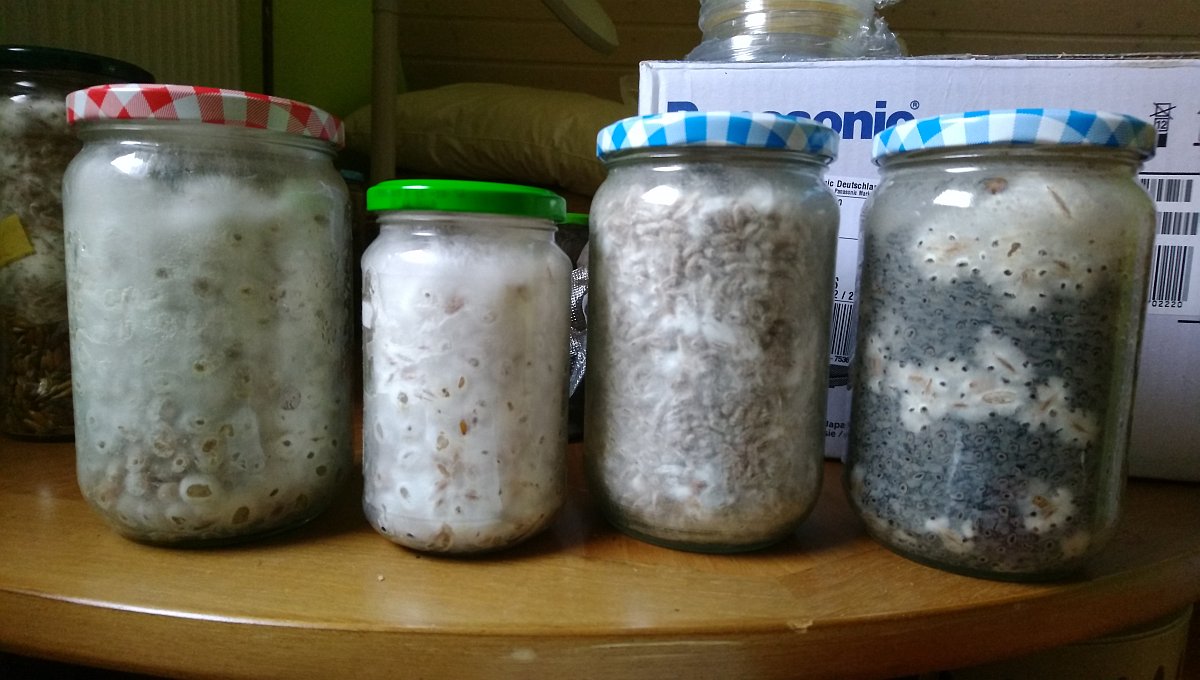 Nebenbei: Ich hab nun öfter auch schon mal mit Hafer gearbeitet. Der Schmeckt der Auster, aber auch dem Shitake und Enoki recht gut. Geht meist etwas fixer als auf Roggen. Die Schüttdichte ist allerdings geringer und so bekommt man in ein Glas weniger Masse.