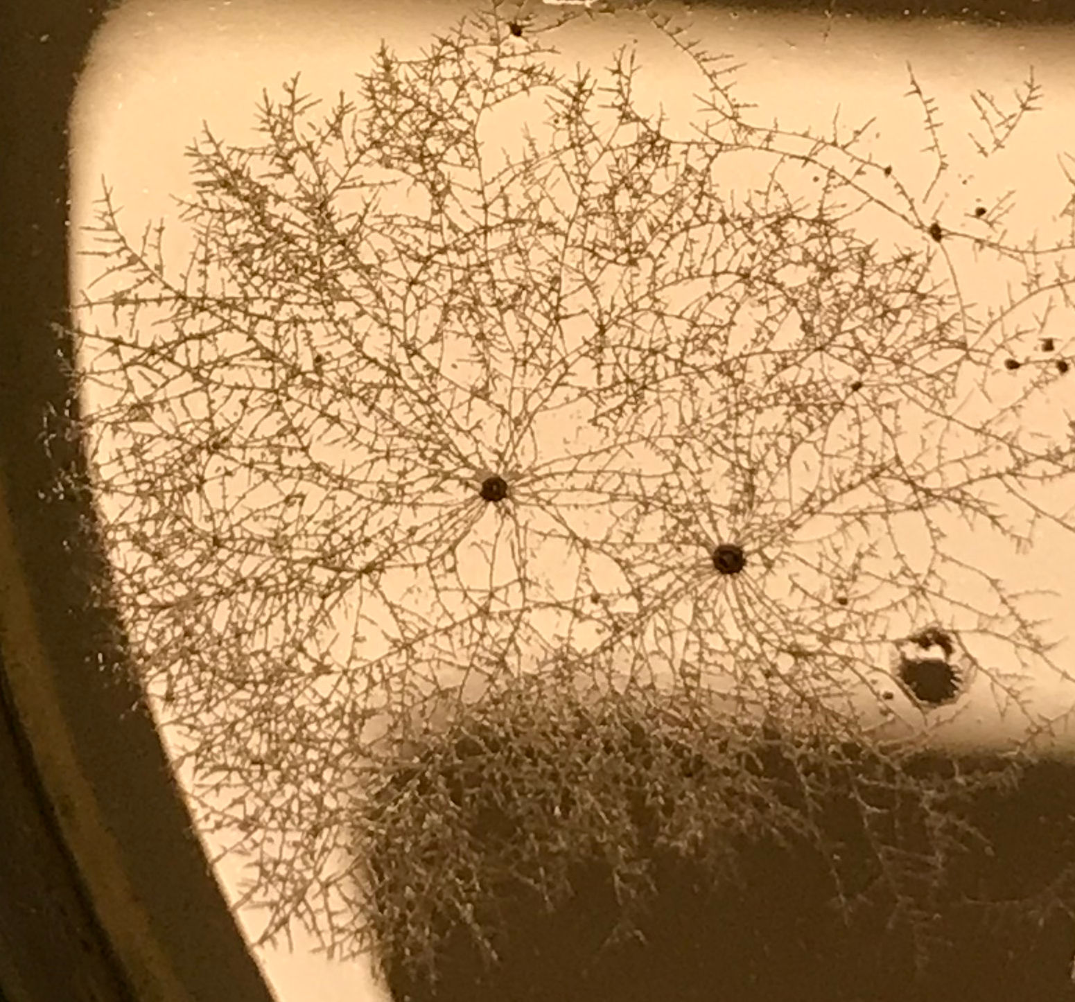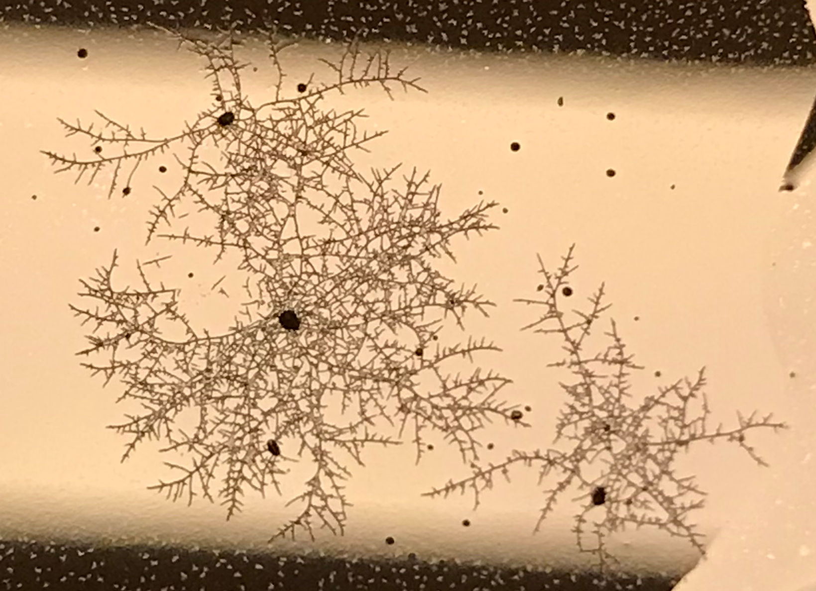 Weil die eigentlich immer am besten gekeimt sind, hab ich versuchshalber mal getrocknete Morcheln über die frisch sterilisierten & ausgekühlten Petris (MEA) ausgeklopft. Zusätzlich hab ich einfach unsteril in Petris eine 5%ige Wasser/Malz-Lösung gekippt und darüber auch bestimmt von 10 verschiedenen getrockneten Morcheln was abgekratzt und dann nochmal was davon unters Mikroskop mit 10-Minütiger Serienbildaufnahme, weil ich mal sehen wollte, wie es keimt. Temperatur ist bei ~20-22°C.