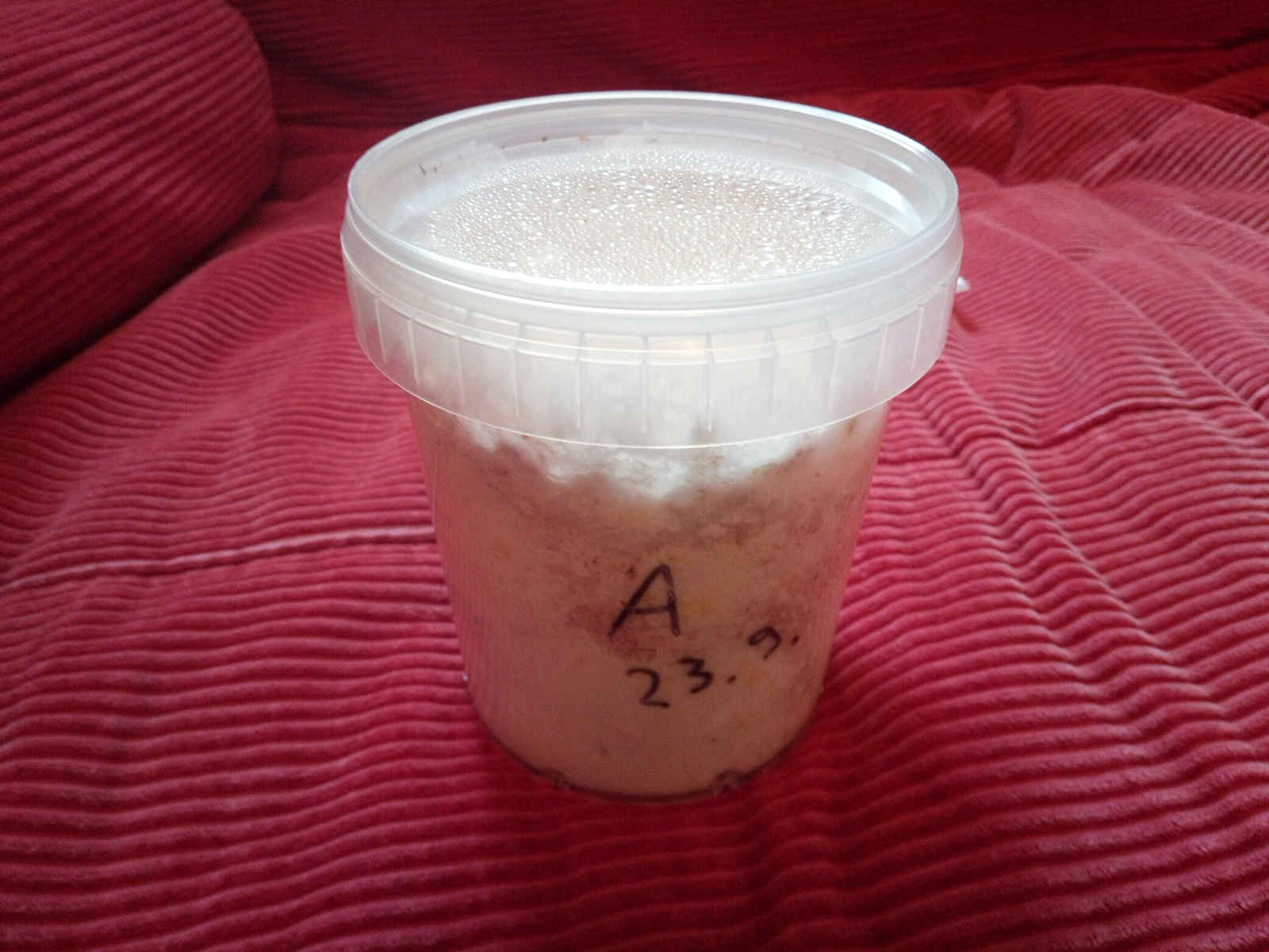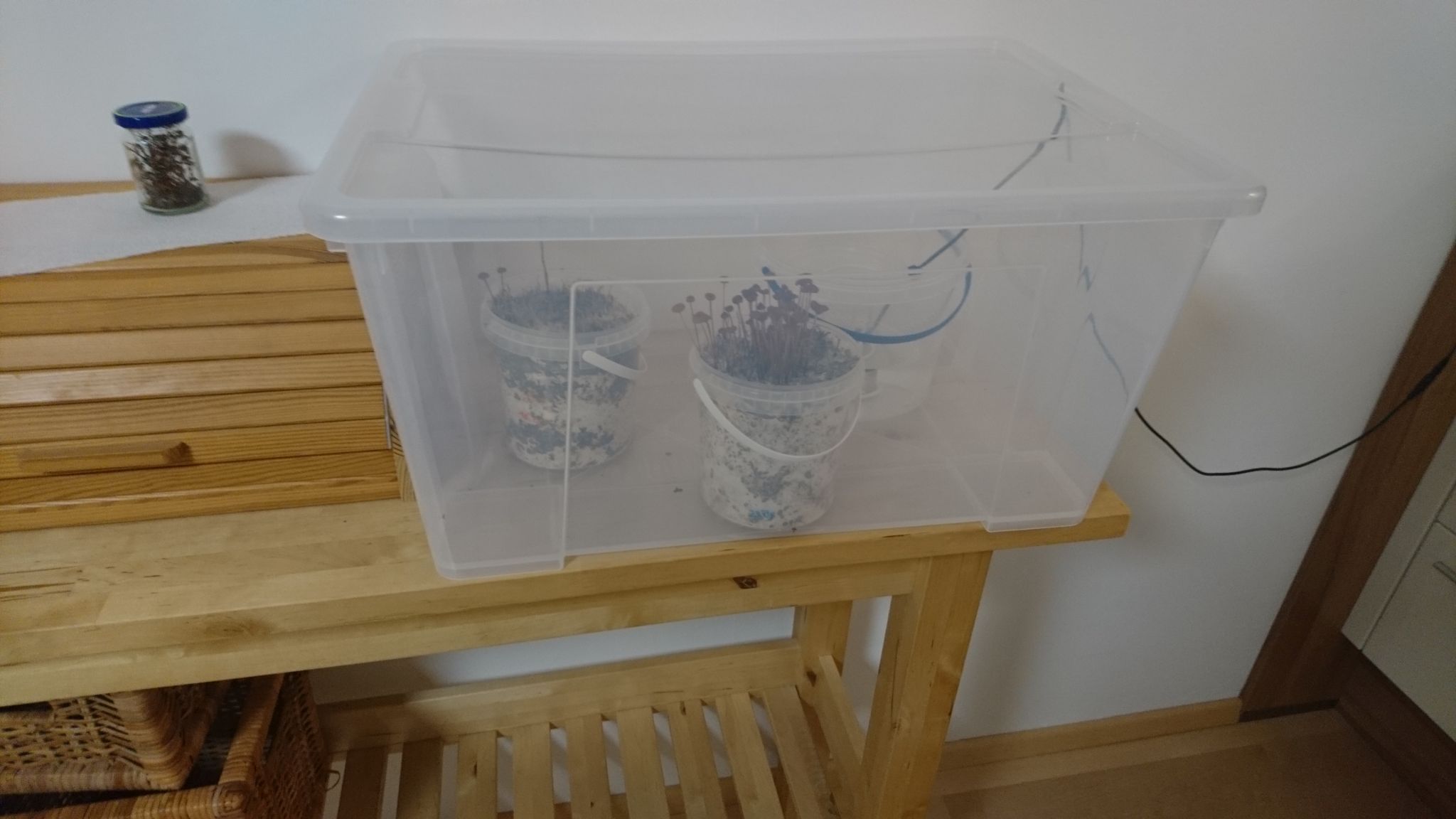 Also die Eimerchen haben keine Löcher. Die sind im Grunde für Lebensmittel wie Suppen oder so gedacht, deshalb aus PP damit sie höhere Temperaturen aushalten. Ich mach de mit nem 6er Bohrer in die Deckel 4 Löcher rein, wo ich 8mm Zigarettenfilter reinstecke. Dann DKT sterilisiere ich die befüllten Eimer. Nach dem Abkühlen (am nächsten Tag) beimpfe ich das steril von der Petrischale und lasse das dann durchwachsen. Oft fängt das dann gleich nach dem Durchwachsen an Fruchtkörper zu bilden. Dann kommt der Deckel runter und die Eimer in die Ikea Box. Dann fruchten die so vor sich hin.