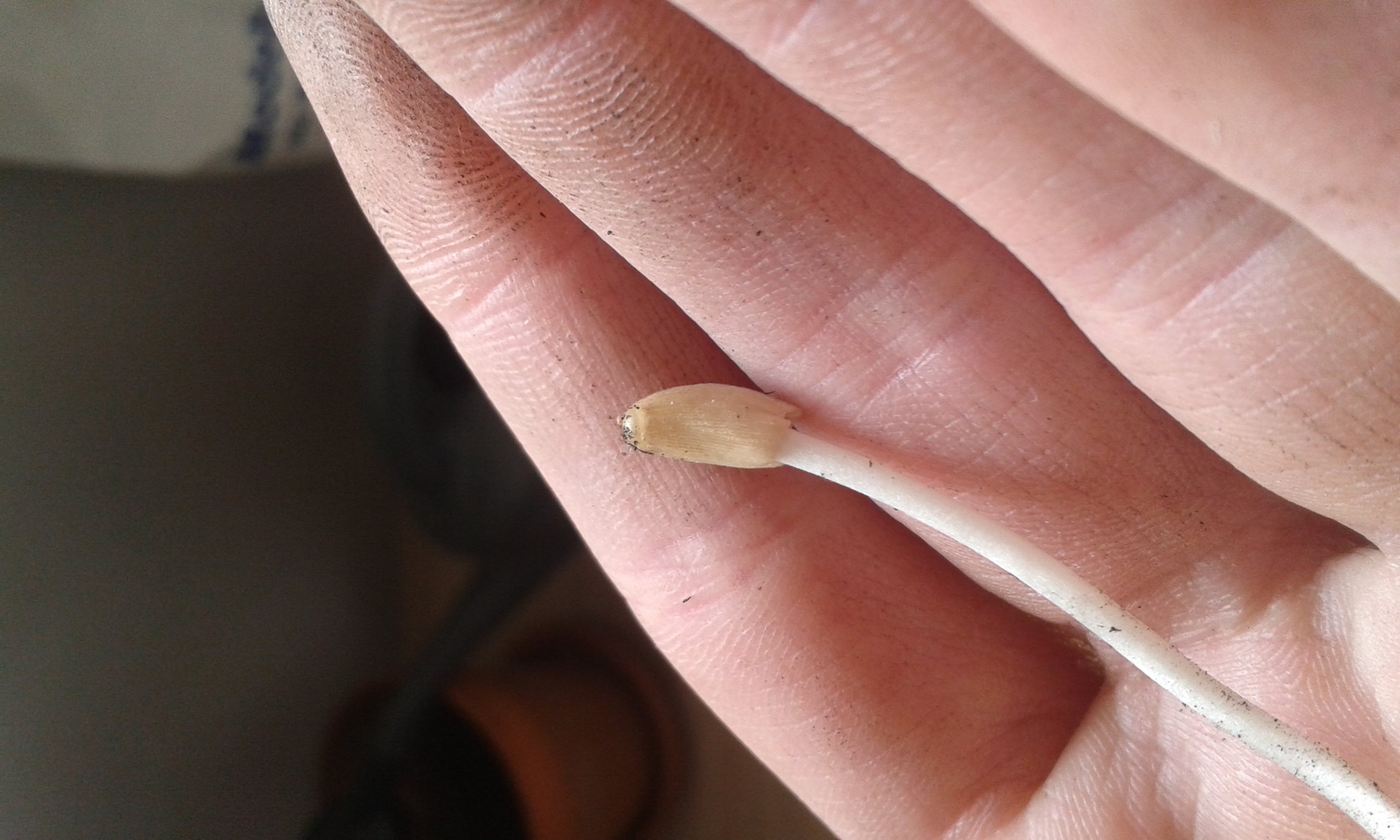 Das ist der stattlichste von ihnen, der Hut ist sogar ganz leicht geöffnet. Ich dachte erst, dass das ja auch eine Pflanzensprosse sein könnte, aber zuersteinmal passt die Konsistenz nicht und zweitens kann man die Myzelien sehen, wie sie ganz fein mit einem Stock verbunden sind. Ich dachte an die Psathyrellas und an (Glimmer)Tintlinge aber keine Ahnung. Hat jemand von euch vllt. eine Ahnung?
