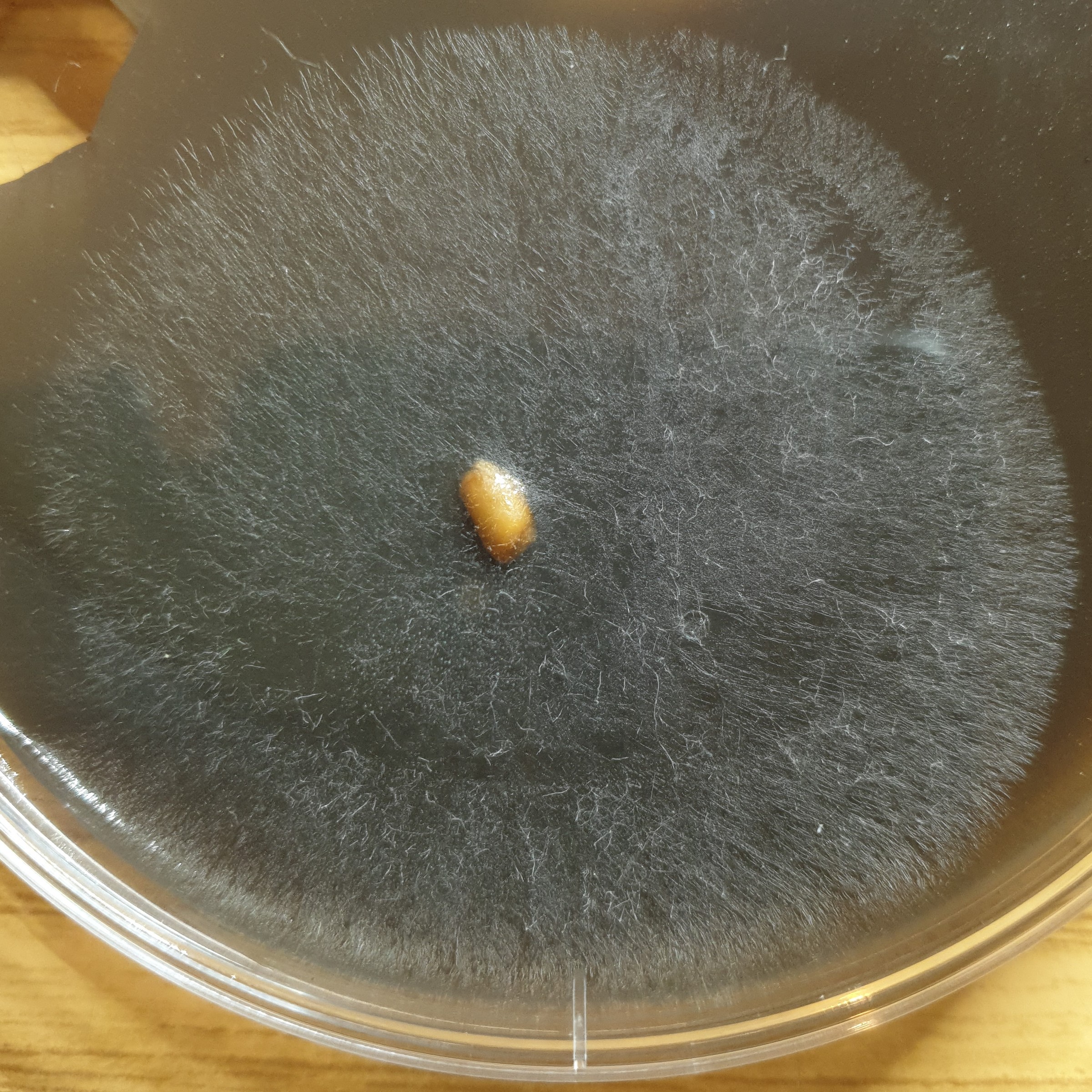 Vorhin habe ich alle Petris von Pilz 2 entsorgt. In einer wuchs an beiden Körnern wieder dieser grüne Schimmel, in den anderen drei Schalen wucherten wahrscheinlich zwei Myzelien. Eines sehr fein verzweigt und platt auf der Agarfläche, ein anderes eher luftig. Jedenfalls passt bei beiden das Muster der Verzweigungen nicht und das luftige Myzel (irgendwas in Richtung Jochpilz, Köpfchenschimmel) bildete schon Sporenbehälter.