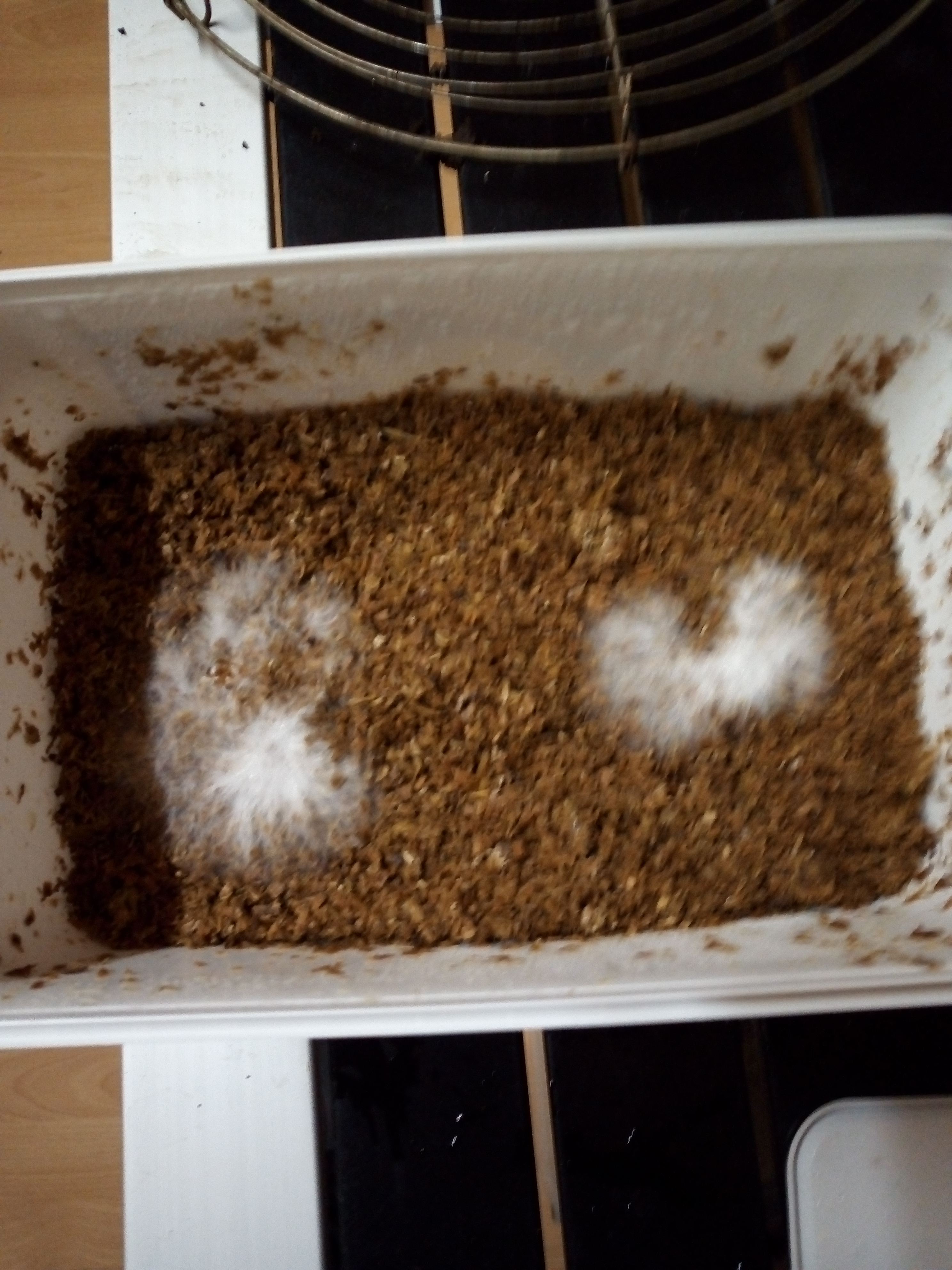 Naja, die Bild Qualität ist nicht optimal, ....aber wenn du das Bild etwas vergrößerst, dann erkennst du die transparenten Streifen und dahinter das wachsende Myzel. Einmal schöne weiß wie es sein soll und einmal ziemlich grün...