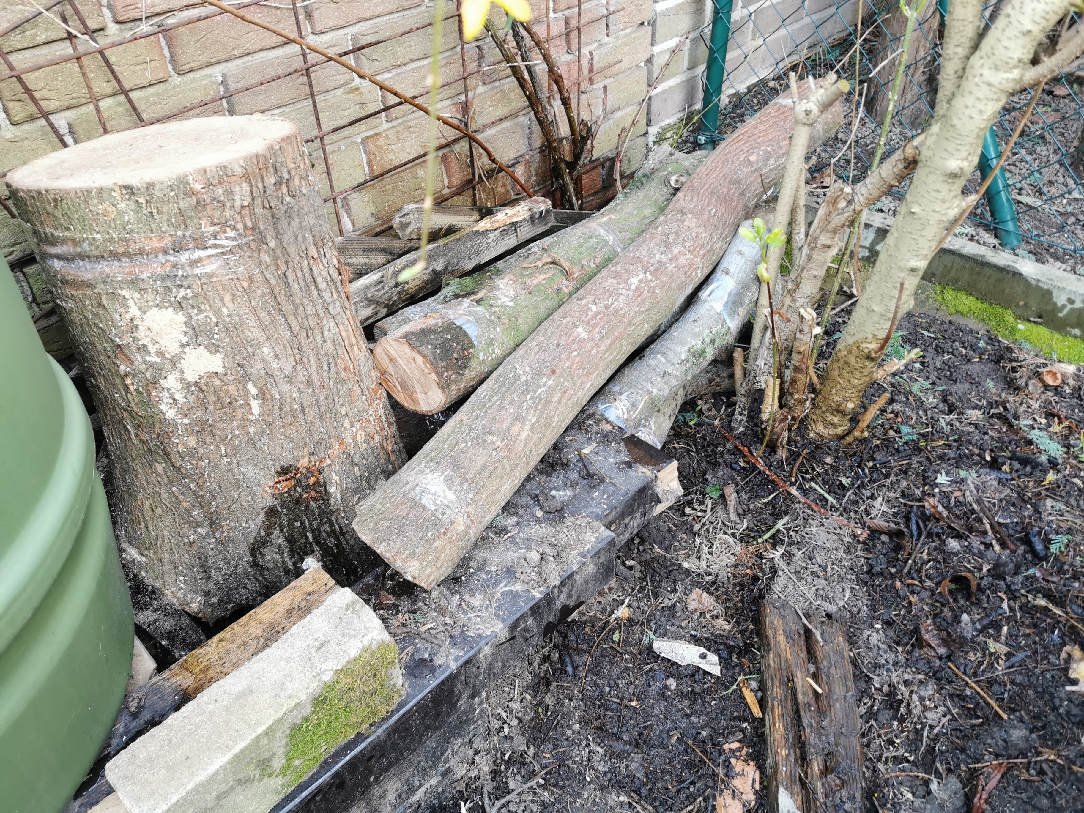 Der Ulmenstumpf wird ebenso beimpft, nur halt mit Ulmenseitling. Der braucht auch nicht extra abgeschattet werden, da dort Schatten genug ist durch die Bäume auf dem Nachbargrundstück. Da in der Nähe, ebenfalls im Schatten, ist das Holz der Ulme gestapelt und wartet ebenso aufs Beimpfen. Das kann quasi da liegen bleiben. In meinem Buch wird eine gelöcherte Folie empfohlen oder auch Jutesäcke, die man feucht halten kann. Darauf wird es auch hinaus laufen, da ich bis dahin dort vermutlich nicht ausreichend Vegetation für ein wirklich gutes Mikroklima habe.