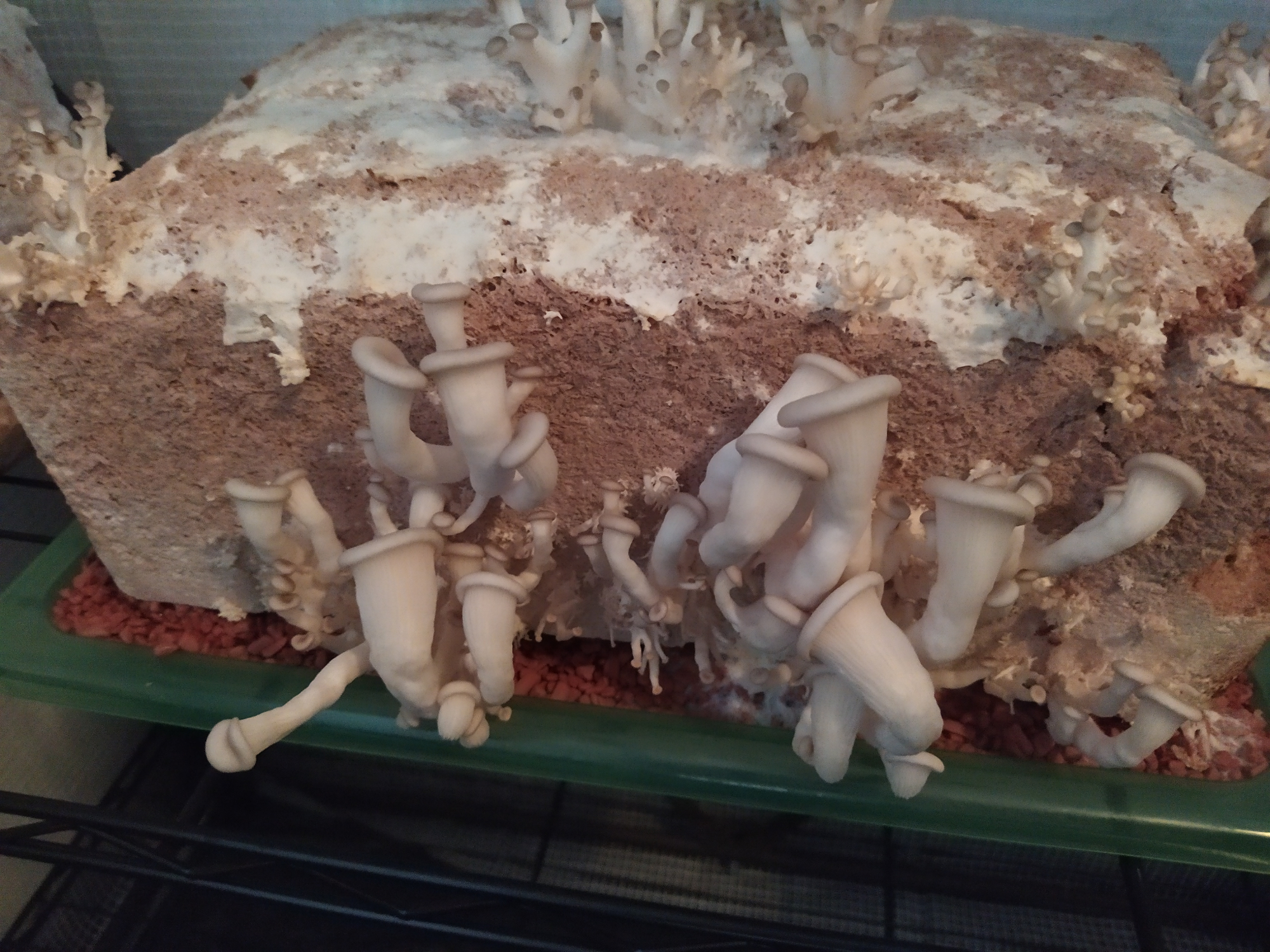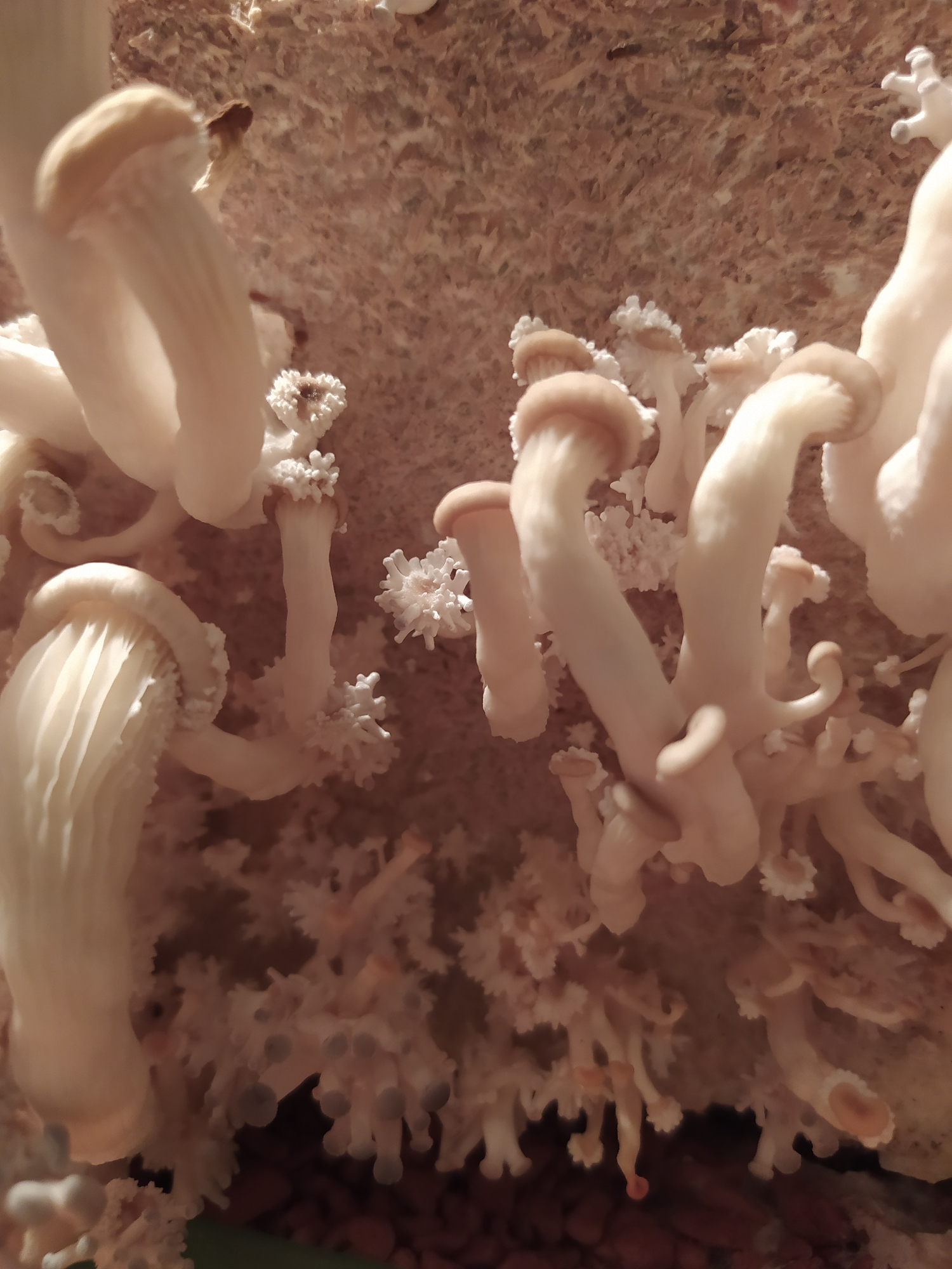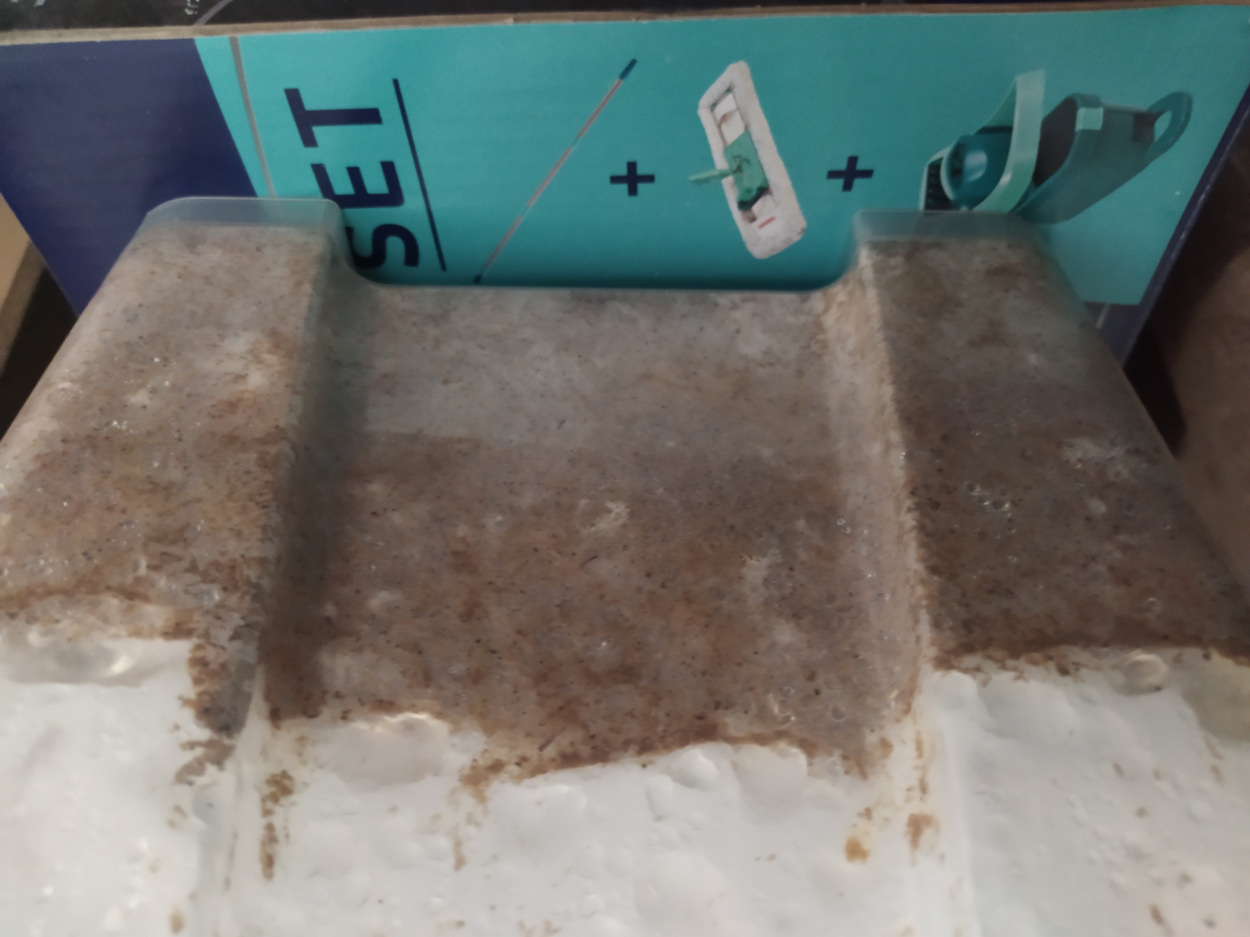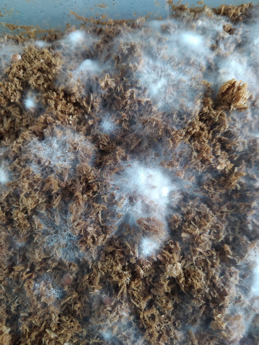 Der Block steht aus: 1000 gr. Pellets, 1100 gr. Wasser, 15 gr. Kalk (von Pilzmännchen). Das Myzel wächst, alles scheint in Ordnung zu sein. Aber ich sehe aufs Myzel solche Miniwassertröpfchen, wie mann auf das Foto auch sehen kann, wenn man es vergrößert.