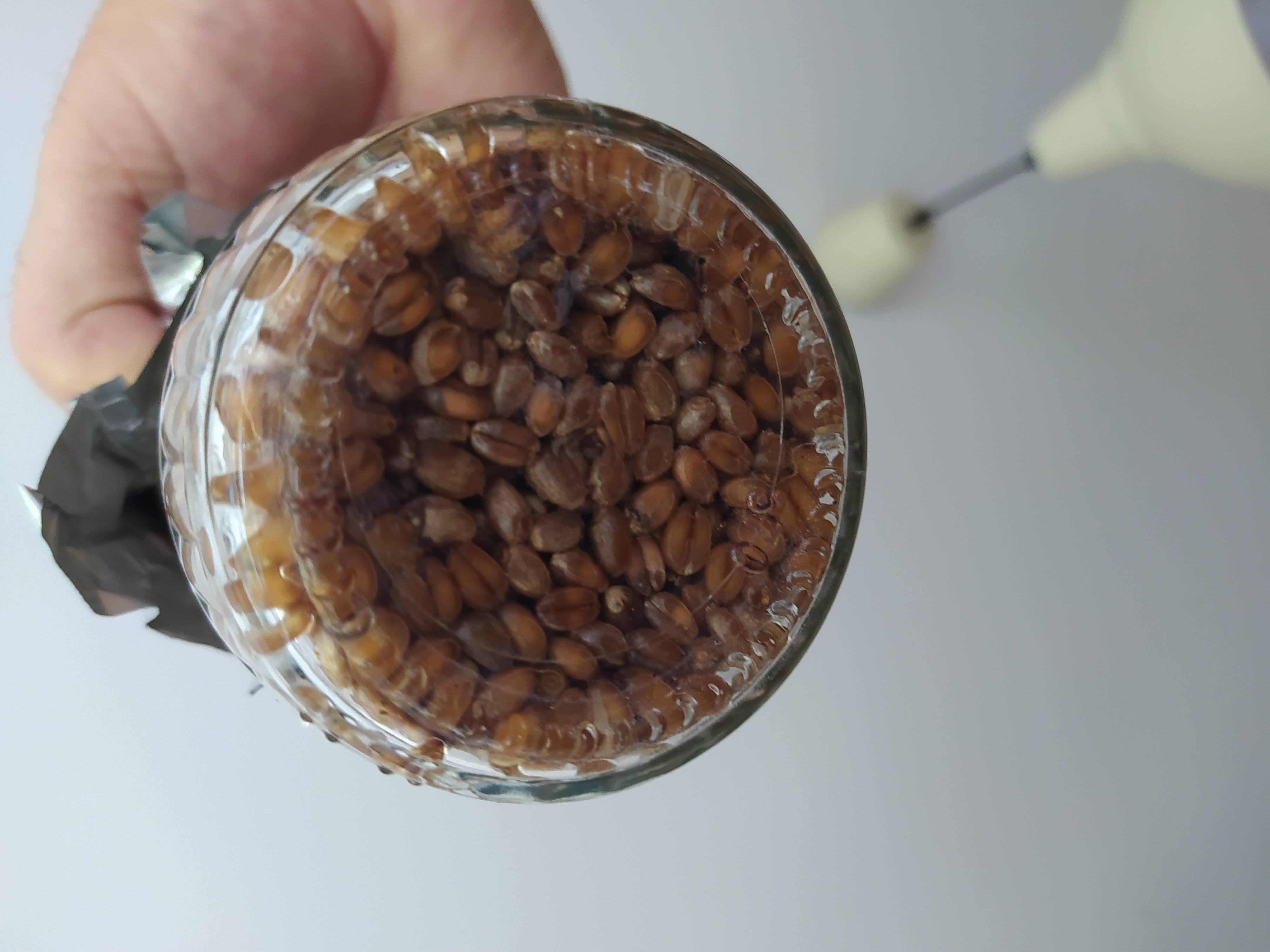 Eingeweichte Weizen, Glass, Loch auf Deckel, Watte im Loch, alles mit Alufolie gedeckt. 95 Min Kochzeit.