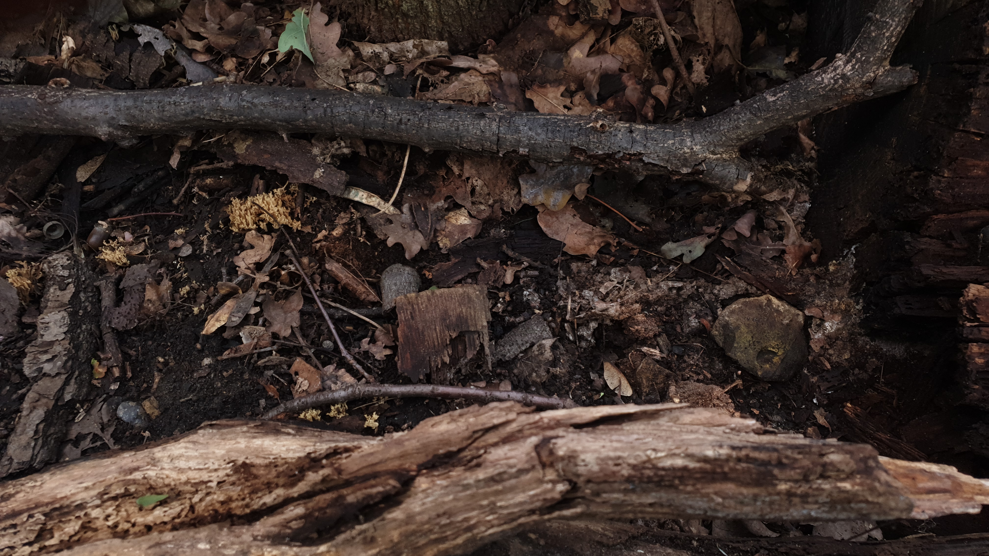 Hier nochmal zwei spätere Fotos vom Fundort, über den ich mich immer noch wundere: Stark morsche Laubholzreste, z.T. wahrscheinlich Robinie, bereits von Braunfäulepilzen zersetzt und wenig Laub von Eiche, Ahorn und Robinie, außer Lignin sollte da eigentlich kaum was zu holen sein.