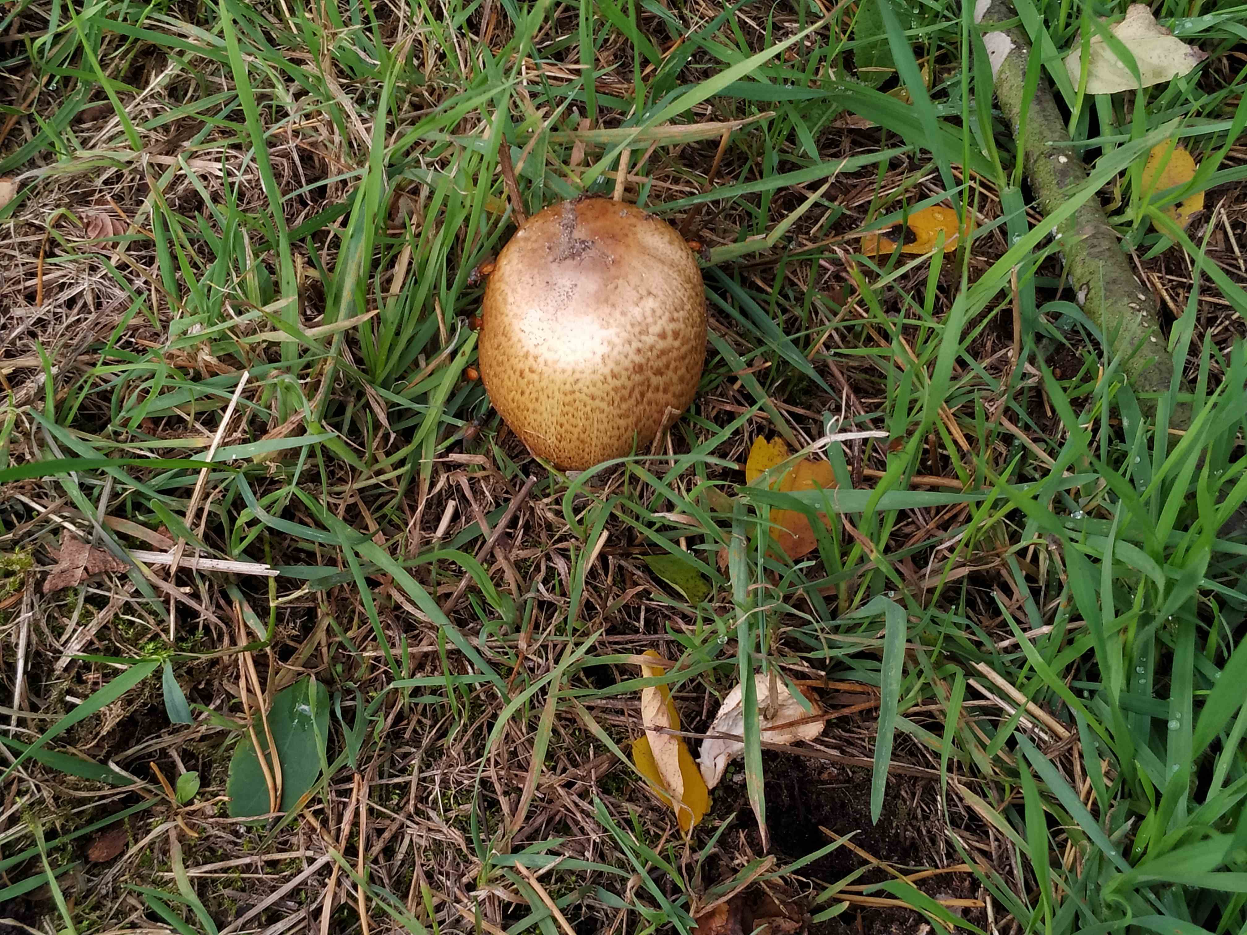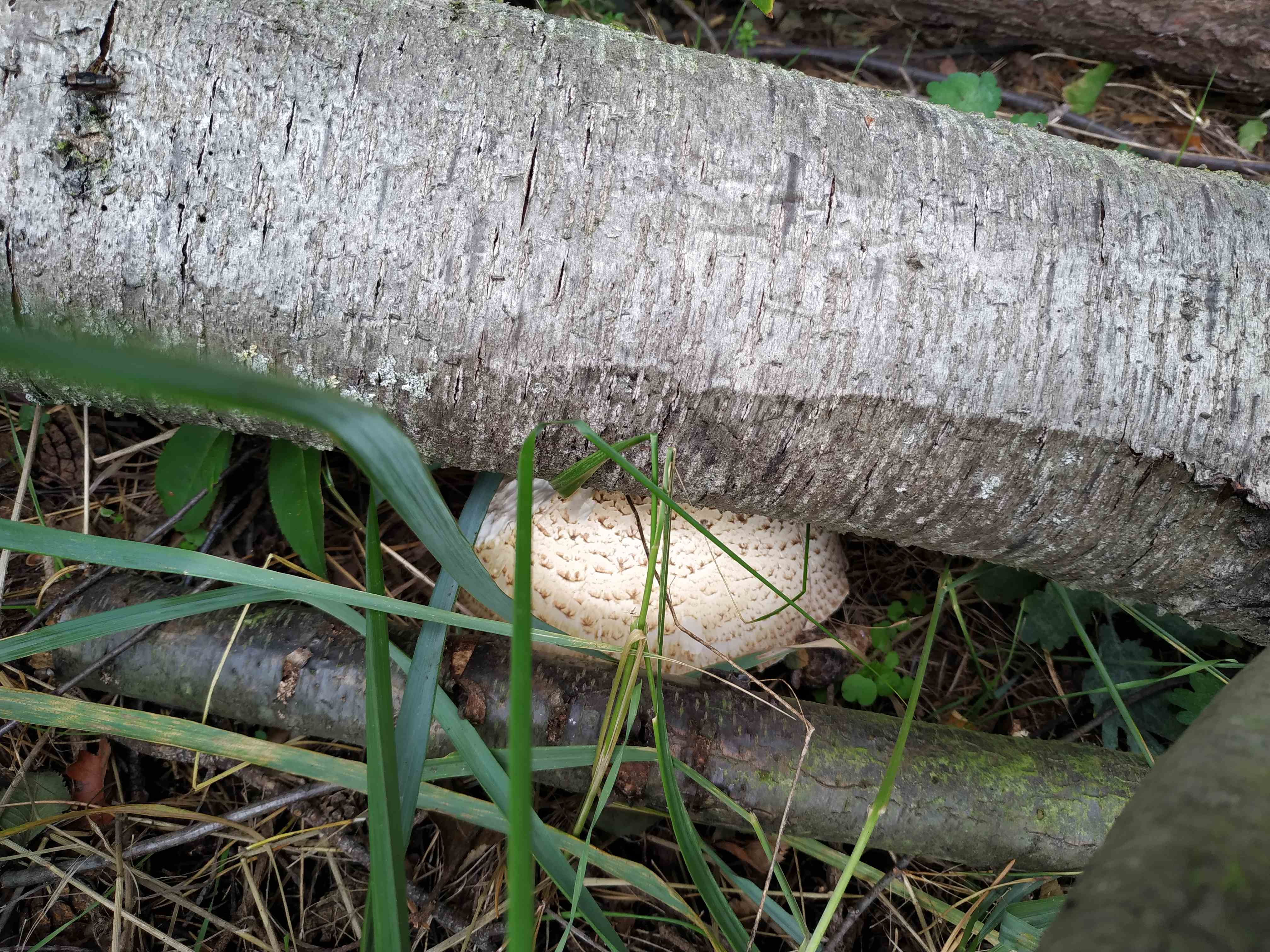 Mitte August fand ich dann ganz unerwartet einen einzelnen, schon aufgeschirmten Pilz, der im oben erwähnten Holzhaufen aus der Erde wuchs. Leider waren Schnecken, Kellerasseln und Pilzfliegen schon zur Stelle. Fotos hatte ich in diesem Beitrag gepostet: