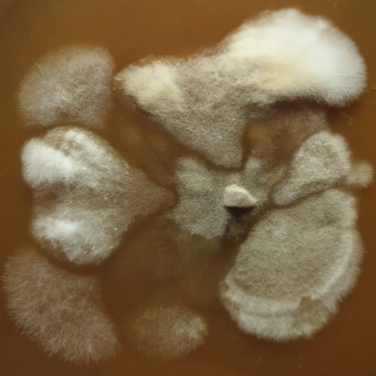 Neben dem eh schon sehr langsamen und ungleichmäßigem Wachstum kommt es immer wieder zum Stillstand und das vorher buschige Myzel wächst plötzlich platt und kaum sichtbar weiter. Zuerst war ich mir sicher, ich hätte irgendein Kontimyzel an Bord, aber nach ein bis zwei Wochen fangen die platten Bereiche oft wieder an, buschig in die Luft zu wachsen. Nach fünf bis sechs Wochen kam es in mehreren Schalen endlich zu schnellerem und kräftigerem Wachstum, aber leider bleibt dieser Effekt beim Überimpfen nicht erhalten. Inzwischen bilden sich auch erste Myzelknoten, allerdings sind noch nirgendwo die für Champignons typischen dicken Myzelstränge aufgetreten.