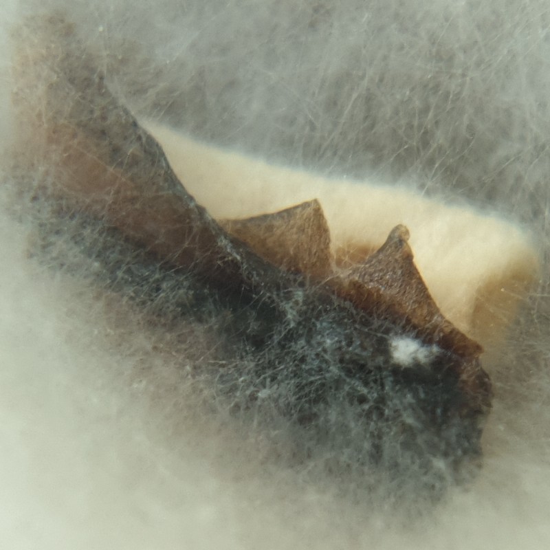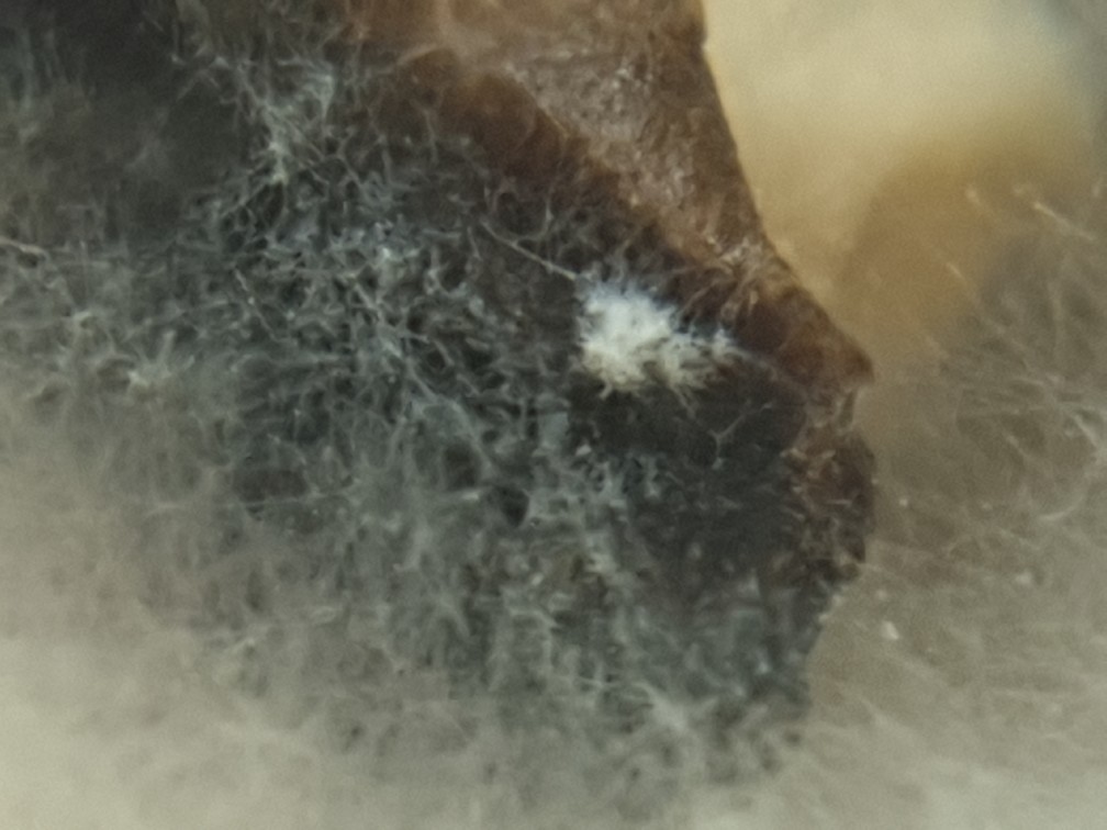 Natürlich hatte ich dann eilig Agar gekocht, sterilisiert, in Petrischalen gegossen und von einem Teil des Hutes Sporen auf Alufolie gesammelt. Nachts wurden dann sieben Hutstücke geklont, z.T. mit Resten der Lamellen dran und zwei Tage später Sporen auf Agar verstrichen. Wie befürchtet, war der Stiel innen völlig von Maden zerfressen und auch im Hutgewebe waren sie fleißig unterwegs. Schon am nächsten Morgen musste ich drei Petris wg. Madenbefall entsorgen, aus einer anderen hatte ich eine einzelne Made herausgefischt. Überraschenderweise zog das keine weiteren Kontaminationen nach sich, obwohl die Made sogar auf dem Agar um das Pilzstück herum gekrochen war. Letztendlich blieben mir dann vier Schalen und schon nach einem Tag waren überall erste Hyphenspitzen zu sehen. Nach fünf Tagen fing das Myzel dann an, den Agar zu besiedeln, jedoch kam es tagtäglich bloß 0,1 bis max. 0,5mm voran. Sporen keimten nicht. Selbst bei den Hutstücken mit Lamellen wuchsen nur ein paar Hyphen aus dem Lamellengewebe und auch als ich nach zwei Wochen Myzel in eine der Schalen mit den Sporen brachte, passierte dort bisher nichts.