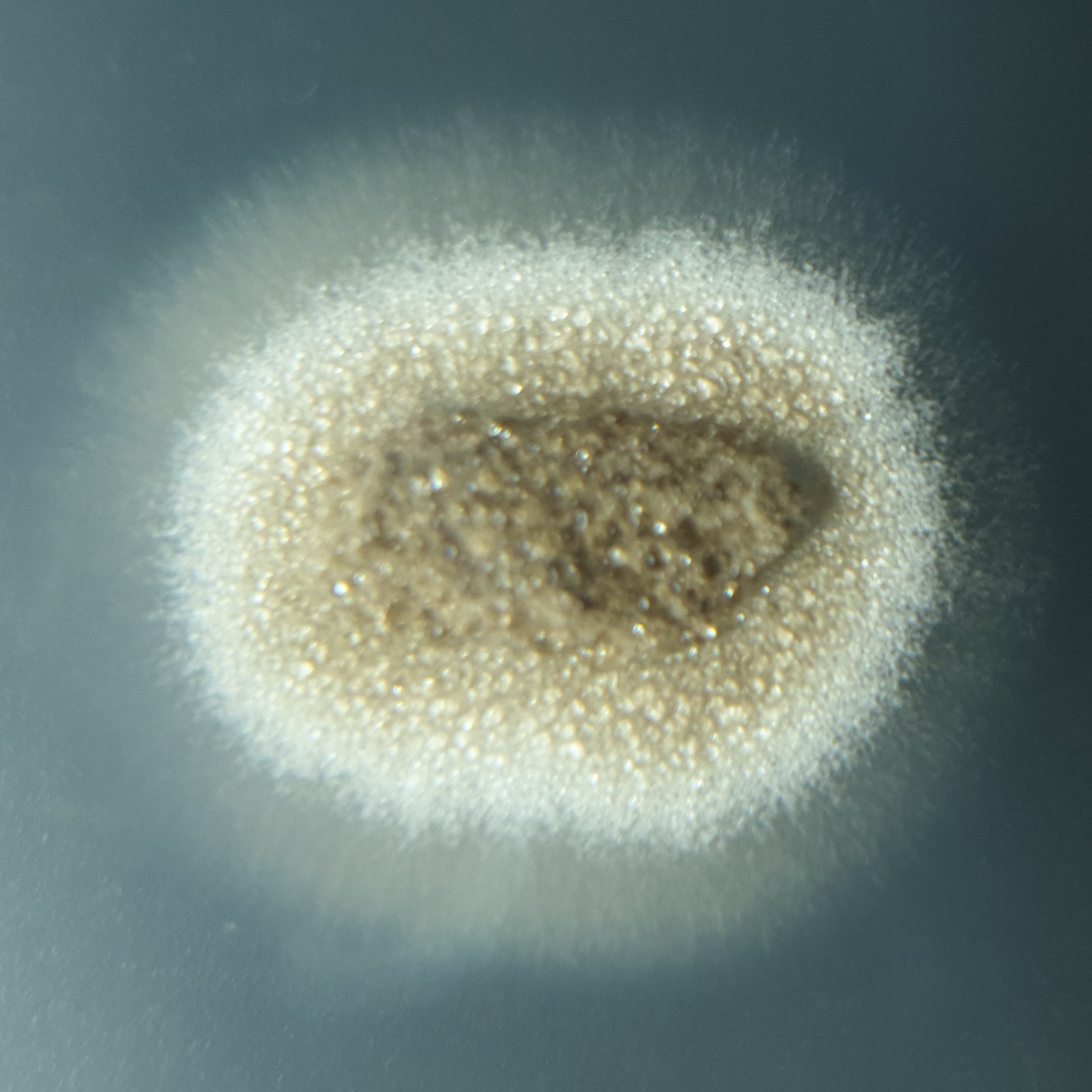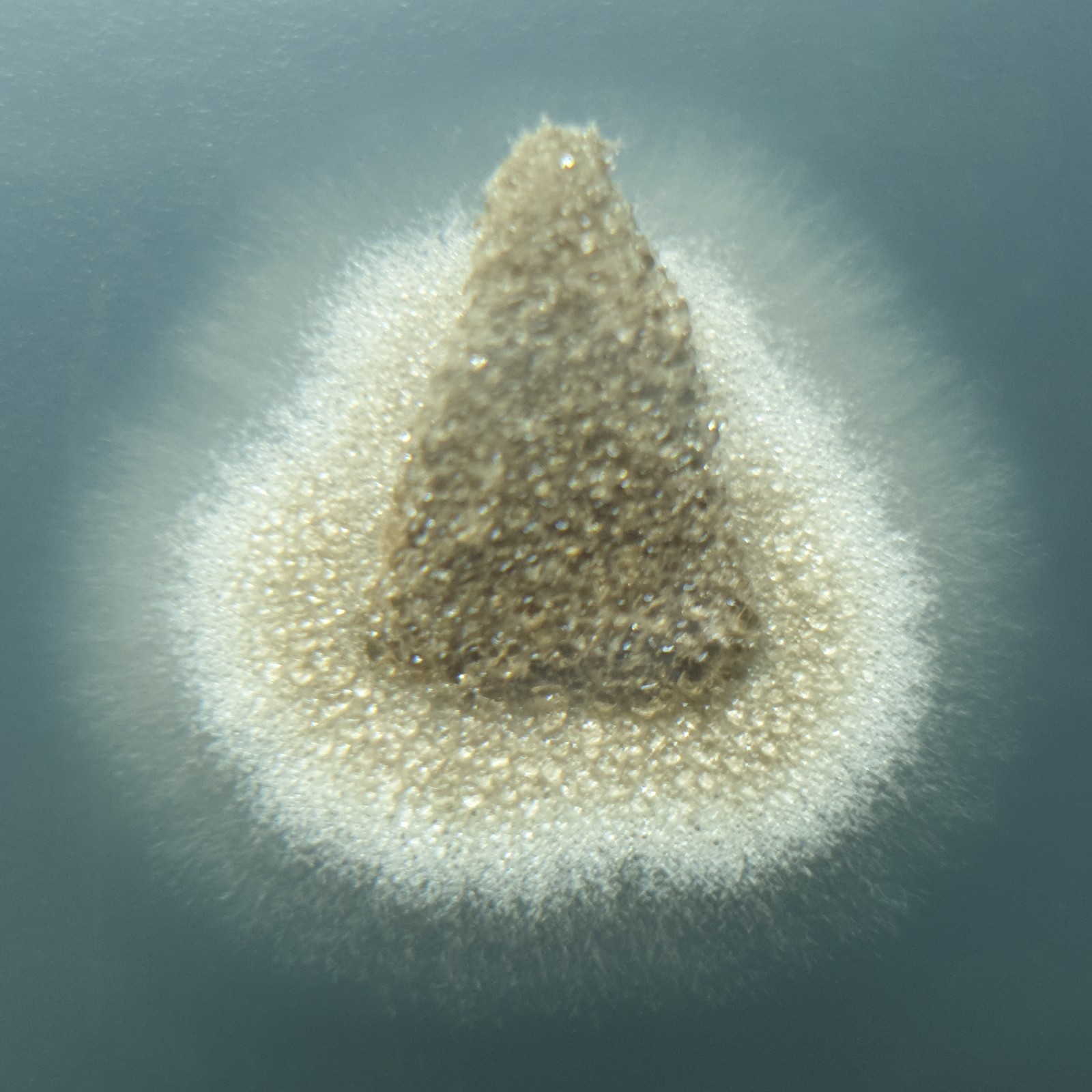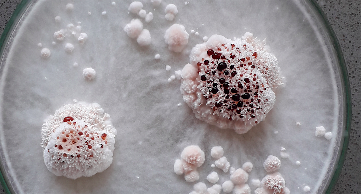 Das Myzel sondert nach ein paar Tagen Tropfen ab und bildet massig asexuelle Sporen.