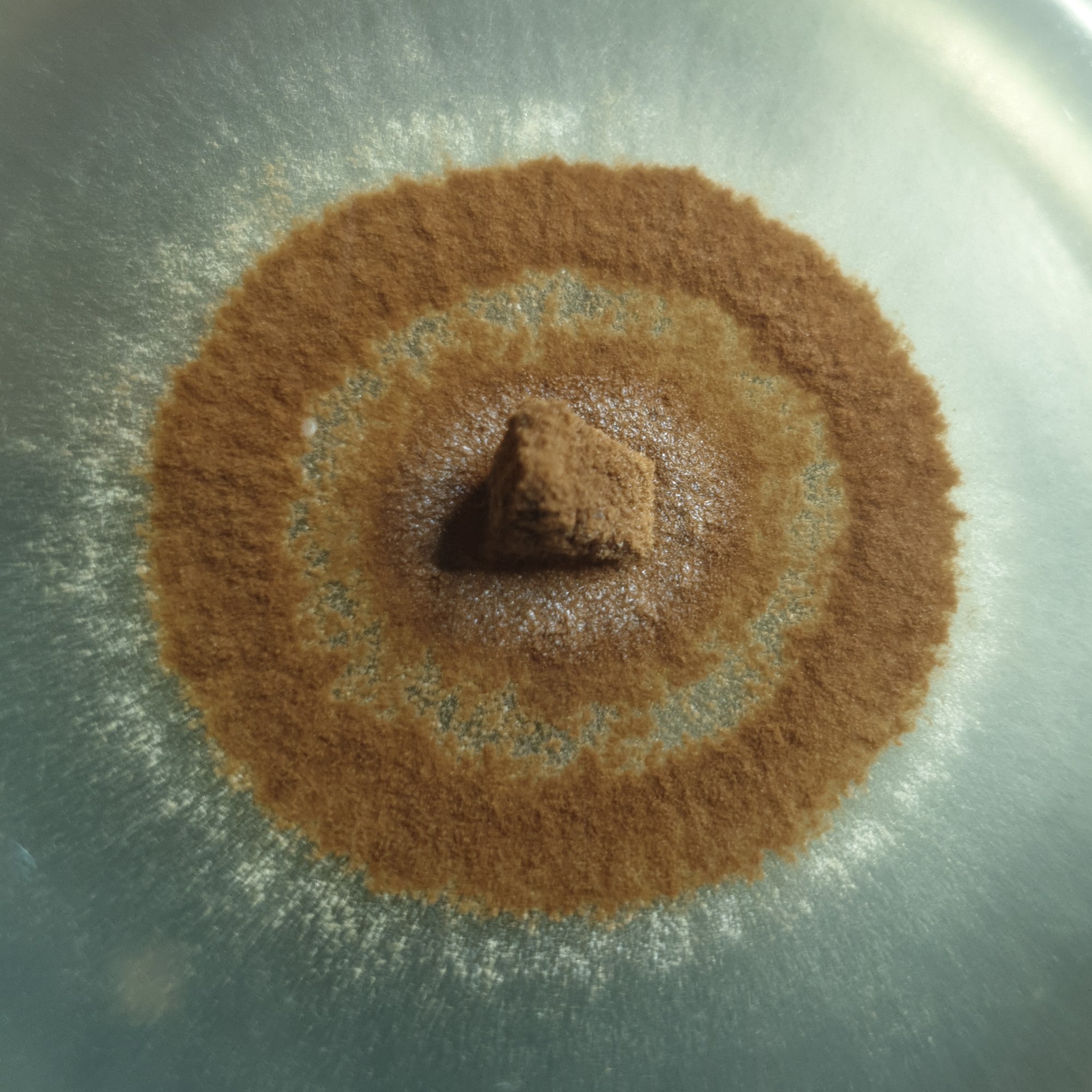 Sparassis brevipes auf PDA auf der Basis von 200 gr. Kartoffeln und 20g Glucose plus 500mg Magnesiumsulfat. pH-Wert eingestellt auf 4.6 mit Weinsäure. Originaler Fruchtkörper war zu alt, um geklont zu werden, aber ich konnte noch einige Sporen retten und zum Keimen bringen.