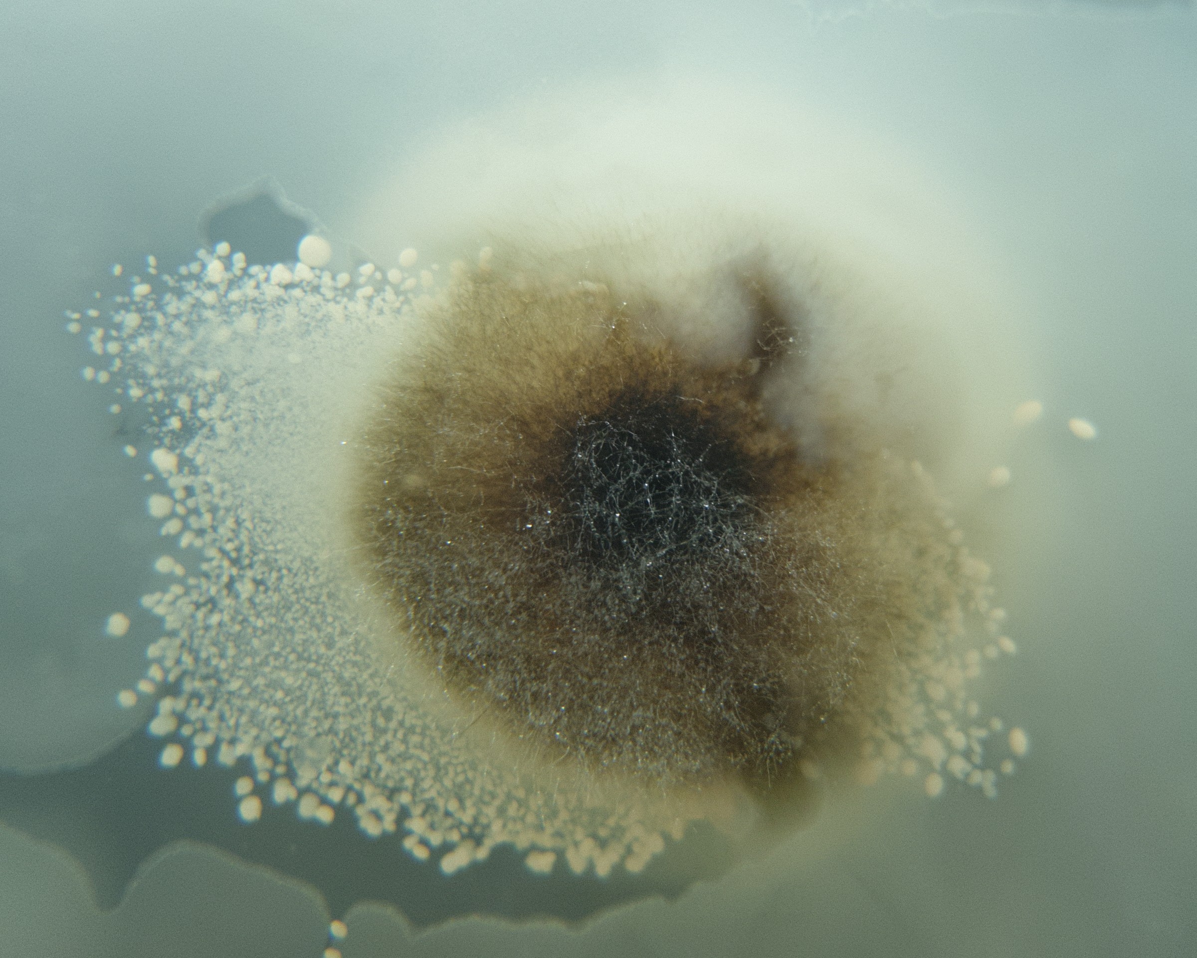 Gerade habe ich wieder etwas ungewöhnliches. Ich hatte versucht, einen Fichtenzapfenrübling zu klonen, was natürlich sofort zu einer Schleimorgie ausartete. Einen Tag später wollte ich gegensteuern und hatte Wasseragar drüber gegossen, wodurch ich die Kontis aber noch weiter verteilt hatte.