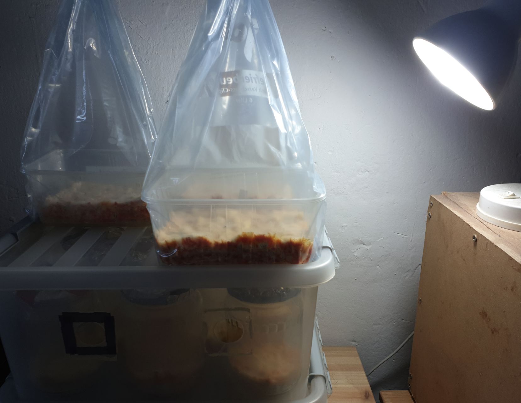 Seit einer Woche werden sie jetzt 12 Stunden am Tag zusätzlich beleuchtet und es zeigt sich deutlich, dass nun mehr Primordien zu Pilzen werden, allerdings wachsen sie sehr langsam und in den Schalen werden die Substrate langsam trocken.