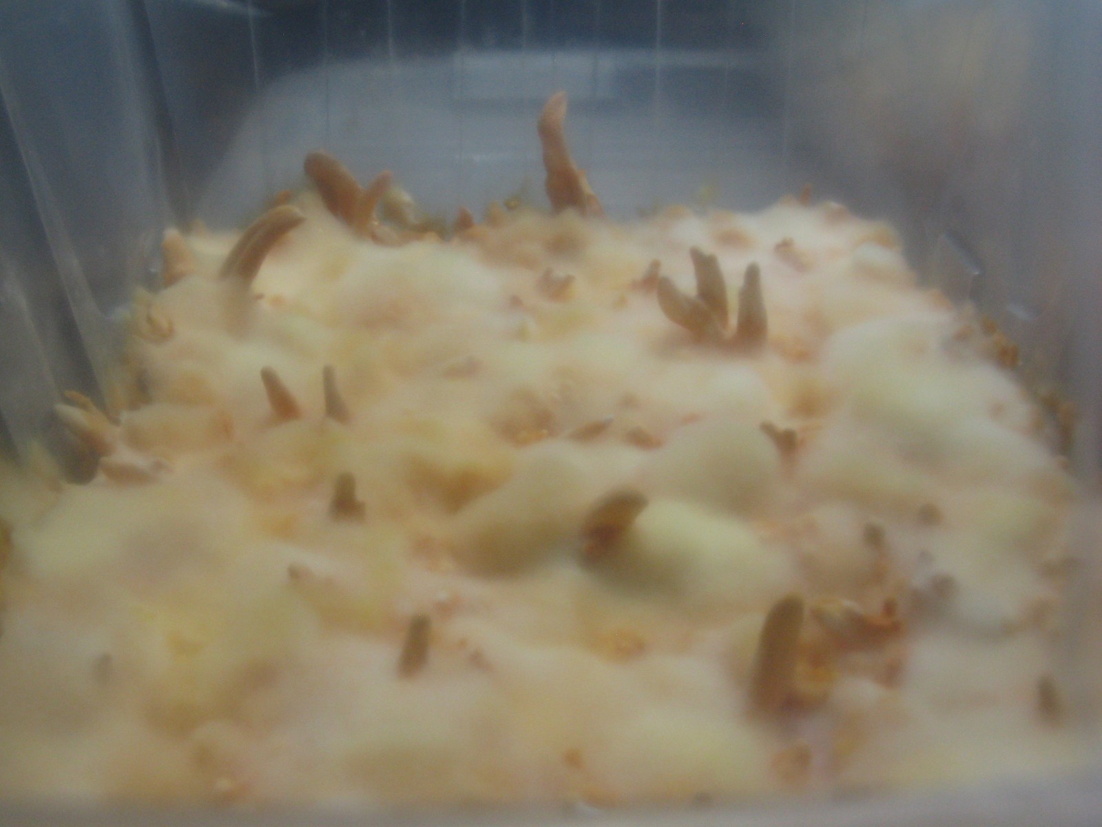 Als ich vor zwei Monaten bemerkte, dass man von C. militaris 10ml-Myzelspritzen für unter 10€ incl. Versand bekommt, dachte ich, ich probiere mal wieder ein wenig damit herum, auch wenn das Myzel dann sicher nicht fruchtet. Um so überraschter war ich, als der Anbieter erzählte, dass er es gerade selbst fruchten lassen hatte und er es alle paar Monate frisch aus den USA bestellt. Natürlich war dann sofort mein Dampfdruckkochtopf im Dauerbetrieb, um schnellstmöglich neun Gläser mit Reissubstrat und LC für die Beimpfung vorzubereiten. Jedes Glas wurde dann mit je 1ml beimpft, das letzte bekam fast 2ml und der letzte Spritzer in die 150ml LC, wo das Myzel schon fast mit beängstigender Geschwindigkeit wuchs. Damit wurde dann nochmal Getreide beimpft, welches in einer Nährlösung eingeweicht und in einem Silikonbeutel sterilisiert wurde. Eine Woche später kam das Getreide dann in Plastikschalen. Die Reissubstrat-Kuchen wurden dagegen gemütlicher besiedelt.