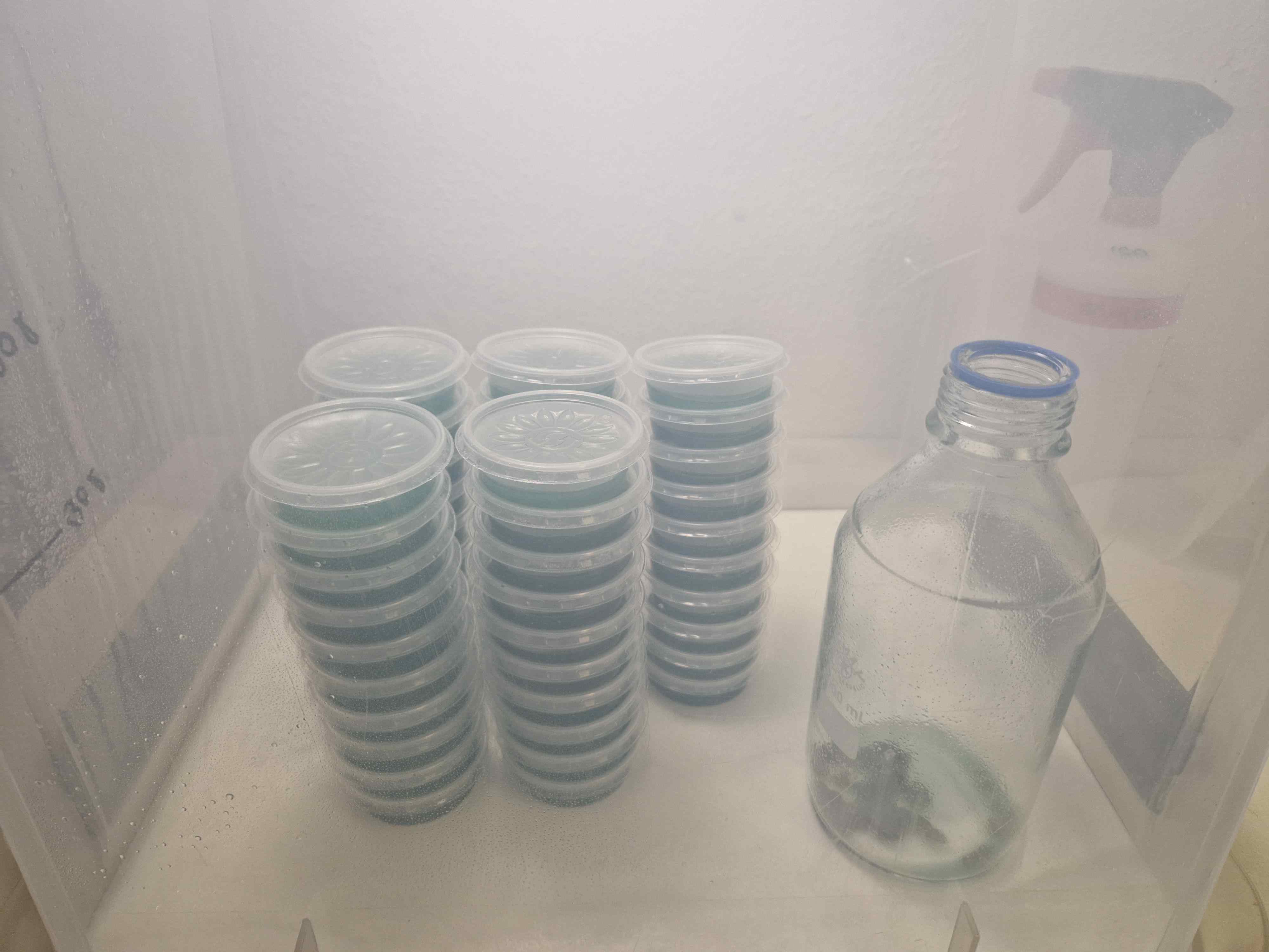 500 ml Agar gibt bei mir etwa 25 bis 28 Schalen. Bis zu 1 Liter Agar kann ich auf einmal gießen, dann wird der Platz in der Sterilbox knapp.