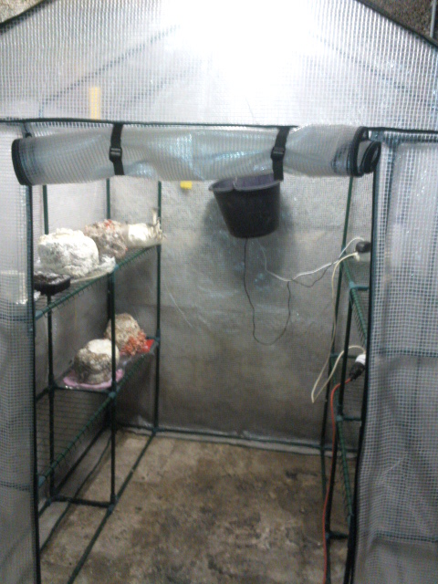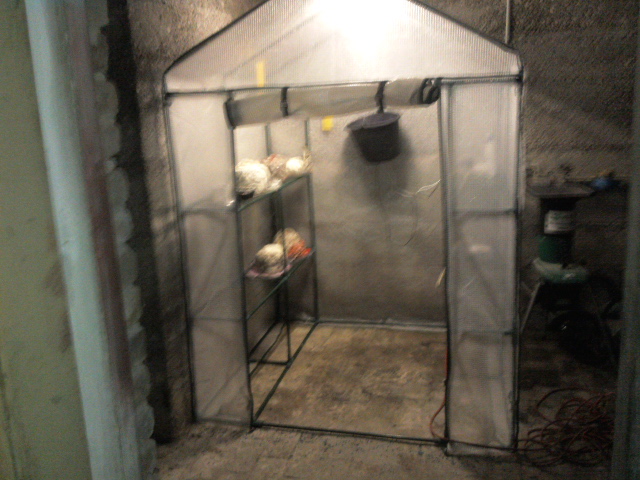 Ich habe im Keller so ein Foliengewächshaus eingerichtet (1,5mx1,5m und 2m hoch , mit 8 Regalböden ) habe das ganze innen mit einer 50w Tageslichtröhre ( 80cm ) ausgerüstet und einem Mininebler der mit einem Schwimmer im Eimer hängt wegen der Luftfeuchte,habe Temperatur konstand 17° und 90% Luftfeuchte.