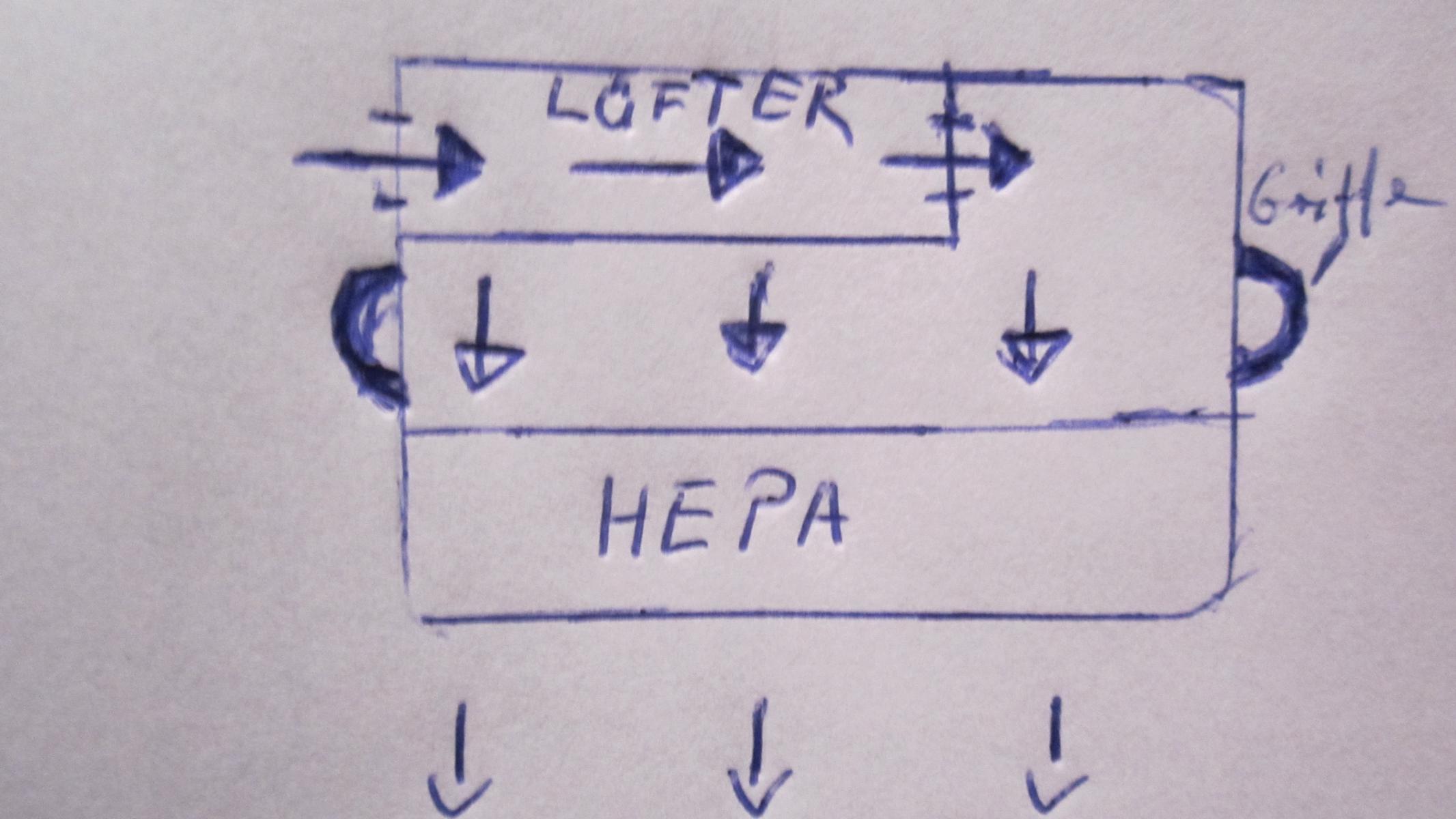 Bei meiner konstruktion beträgt der absand zwischen der hepa kassete und dem lüfter nur ca 10 cm und der Luftstrom ist wie in der Graphik dargestellt gegen eine der Außenwände gerichtet. Trotzdem entweicht der druck gleichmäßig durch die Hepa kassette. Mein Vorfilter besteht aus filtermaterial für dunstabzugshauben. Vielleicht mache ich noch mal Fotos. Das ganze ist alllerdings "eher funktional" gebaut und nicht unbedingt präzise gearbeitet(habe einfach alles mit Silikon zusammengeklebt :D).