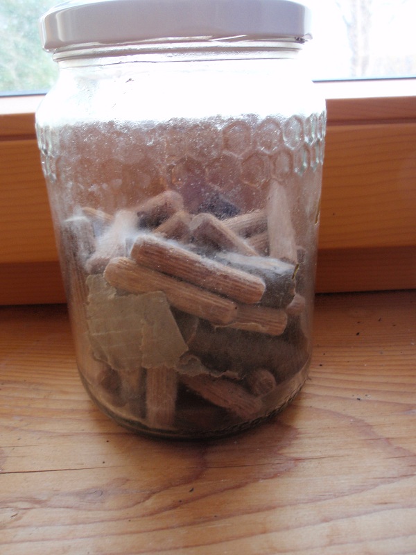 Von dem Holunderast werde ich Scheiben schneiden und in Gläser mit einem Gemisch aus abgekochten Buchenhäcksel, (fein aus der Tierhandlung ) Kaffeesatz und trockener Weizenkleie "einlegen". Verhälltniss 3:1:2.