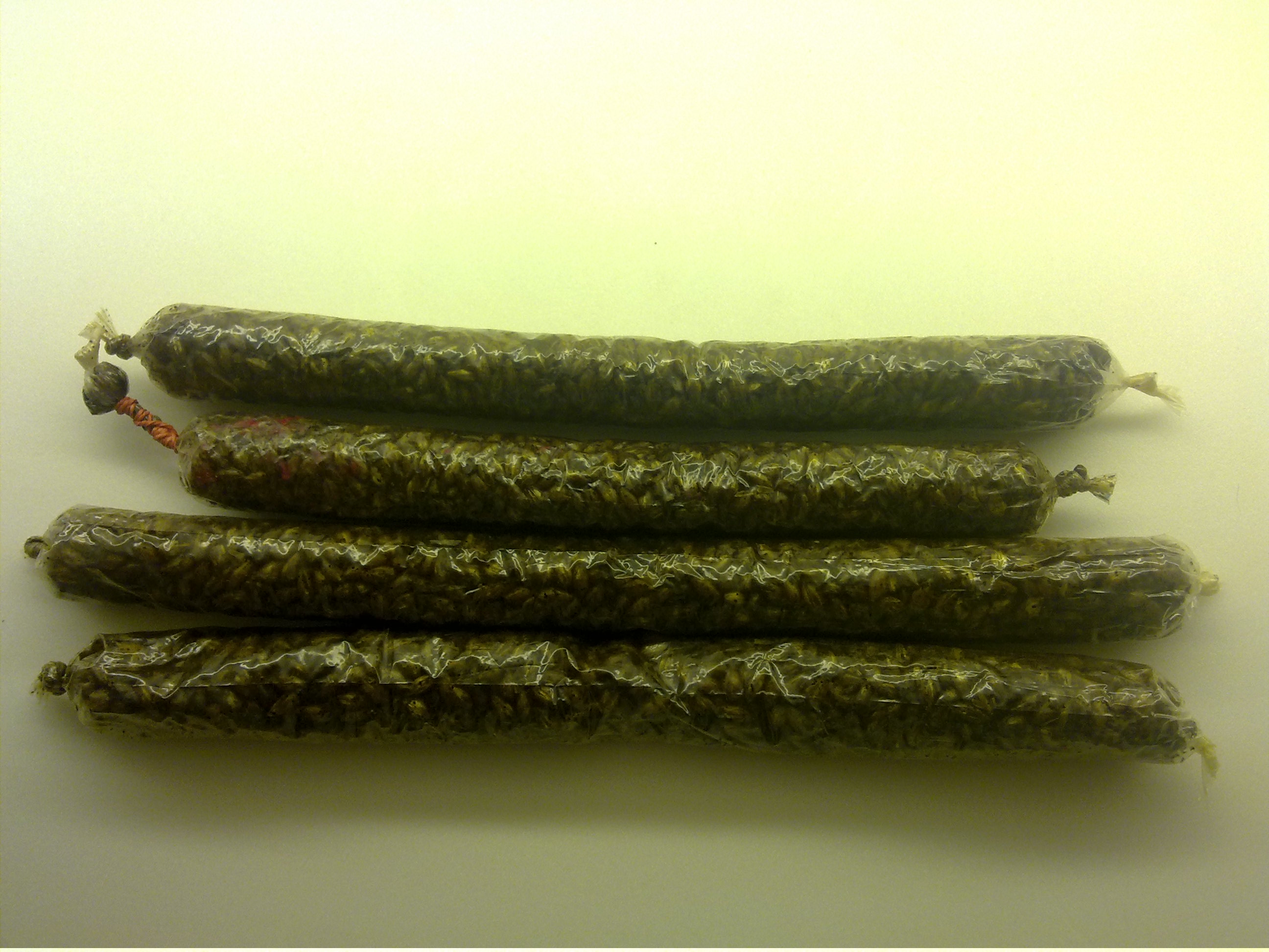 Leider habe ich die Würste im warmen Wohnzimmer offen rumliegen lassen, sodass sie nach 2-3 Wochen komplett ausgetrocknet waren. Beim nächsten Mal müsste man sie dann in eine Styroporkiste zusammen mit etwas wassergetränktem Seramis oder ähnlichem geben um ein Austrocknen zu vermeiden.