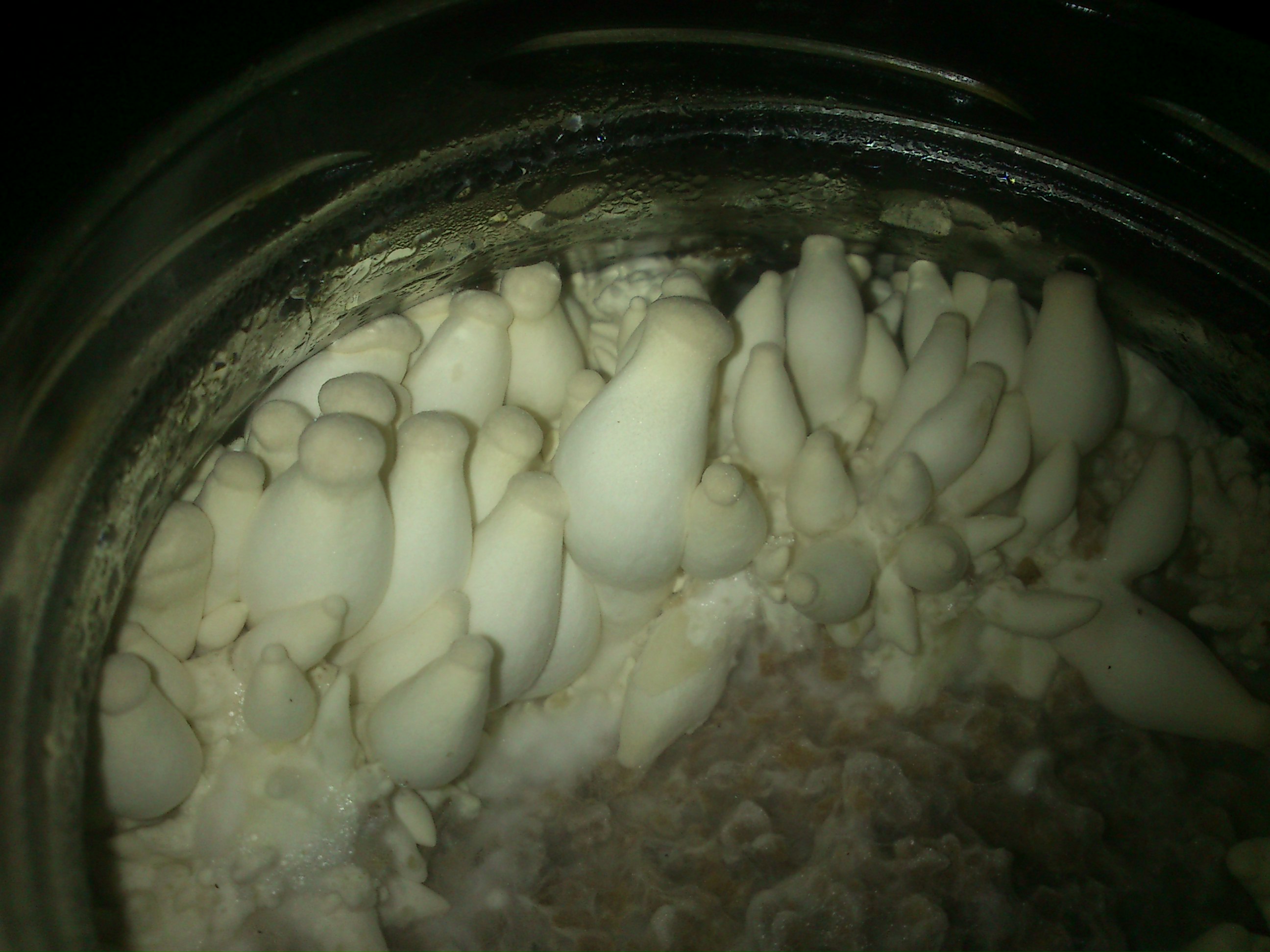 Es sind Kräuterseitlinge, geklont vom Supermarkt, auf Laubholzspänen, mit ca 15% Reismehl im grossen Gurkenglas