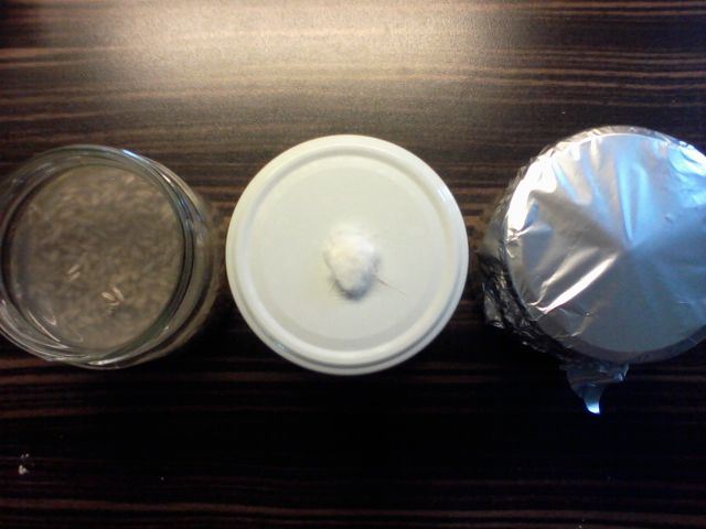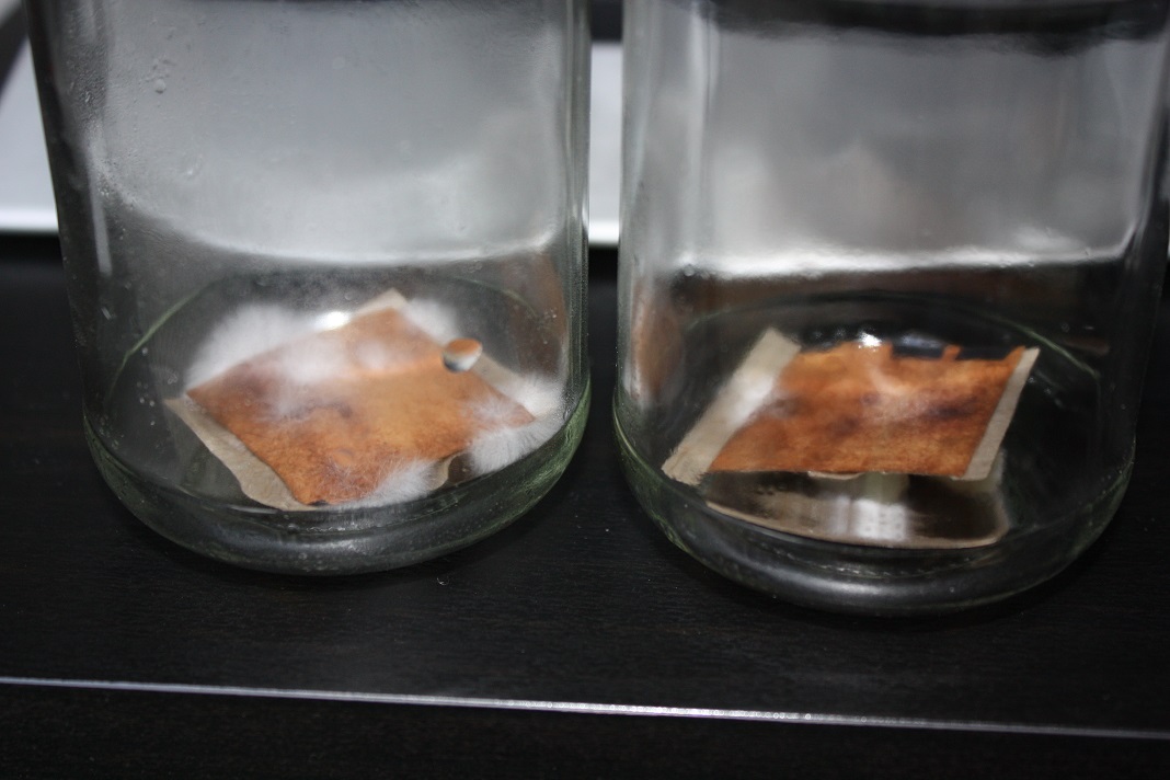 bei beiden kleinen Gläsern zeigt sich deutlich sichtbares Myzelwachstum, Gerstenmalz wird bewachsen. Feuchtigkeit und erhöhte Temperatur scheinen das Wachstum zu fördern.