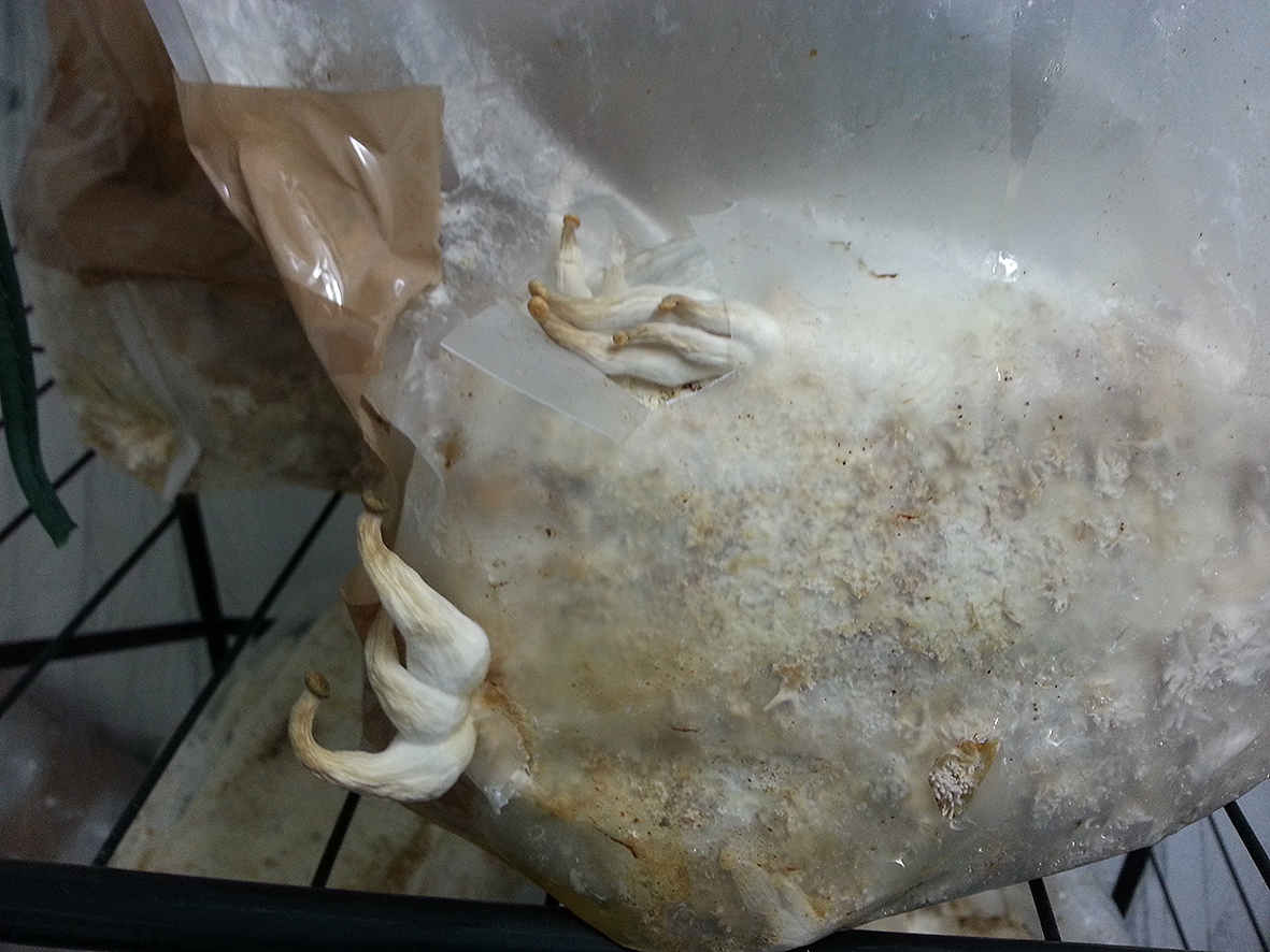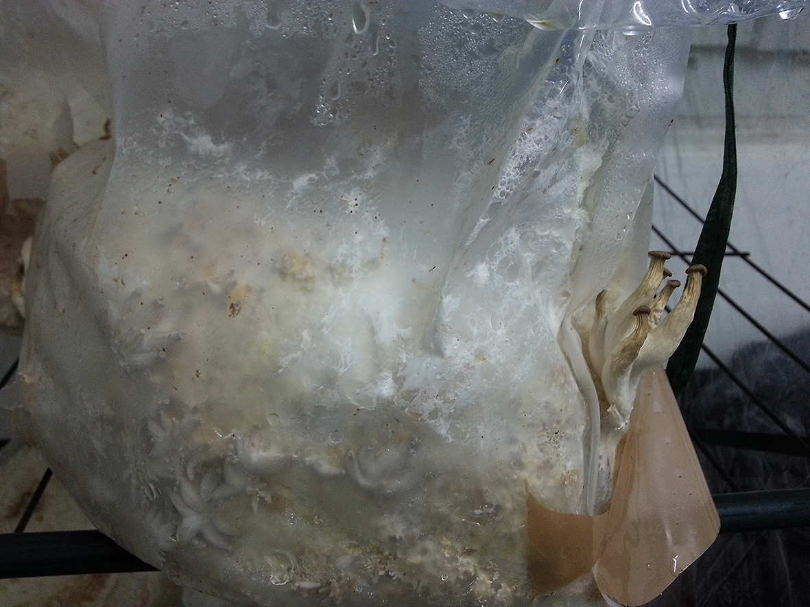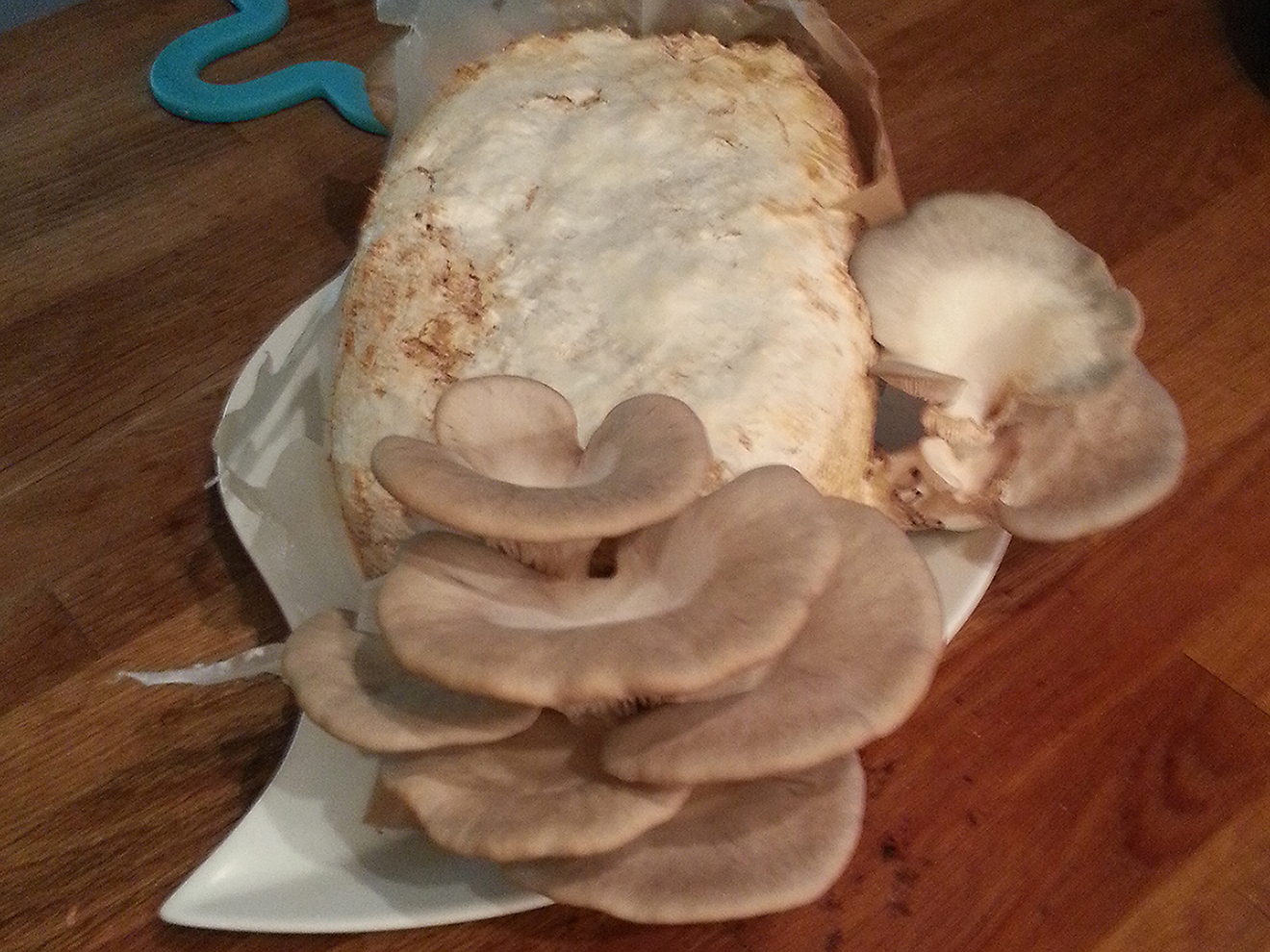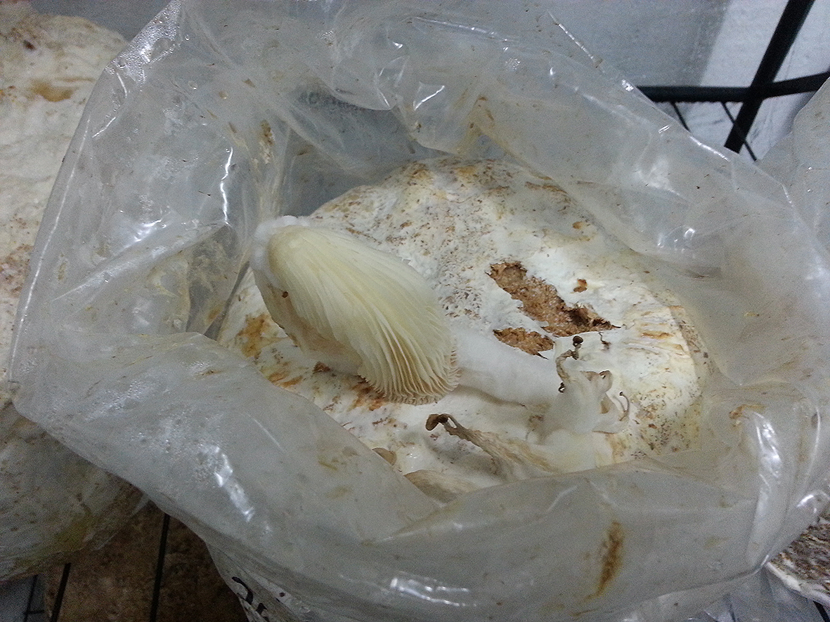 Ich habe jetzt mal einen Substratsack von den den Austern ausgepackt und mit hoch in die Wohnung genommen, wo mehr Licht und Sauerstoff ist.