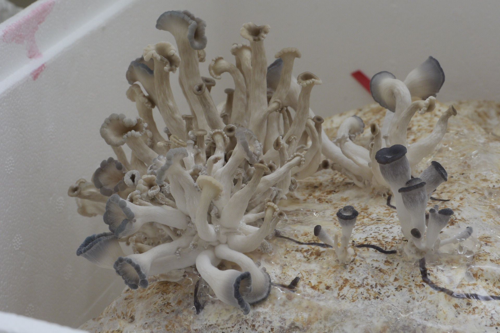 Da werden die Austern jetzt besser. Ich habe im Keller jetzt mal zusätzlich das Licht am Tage angelassen um zu sehen ob es am Licht liegt oder am CO2, das die Pilze so verkrüppeln.