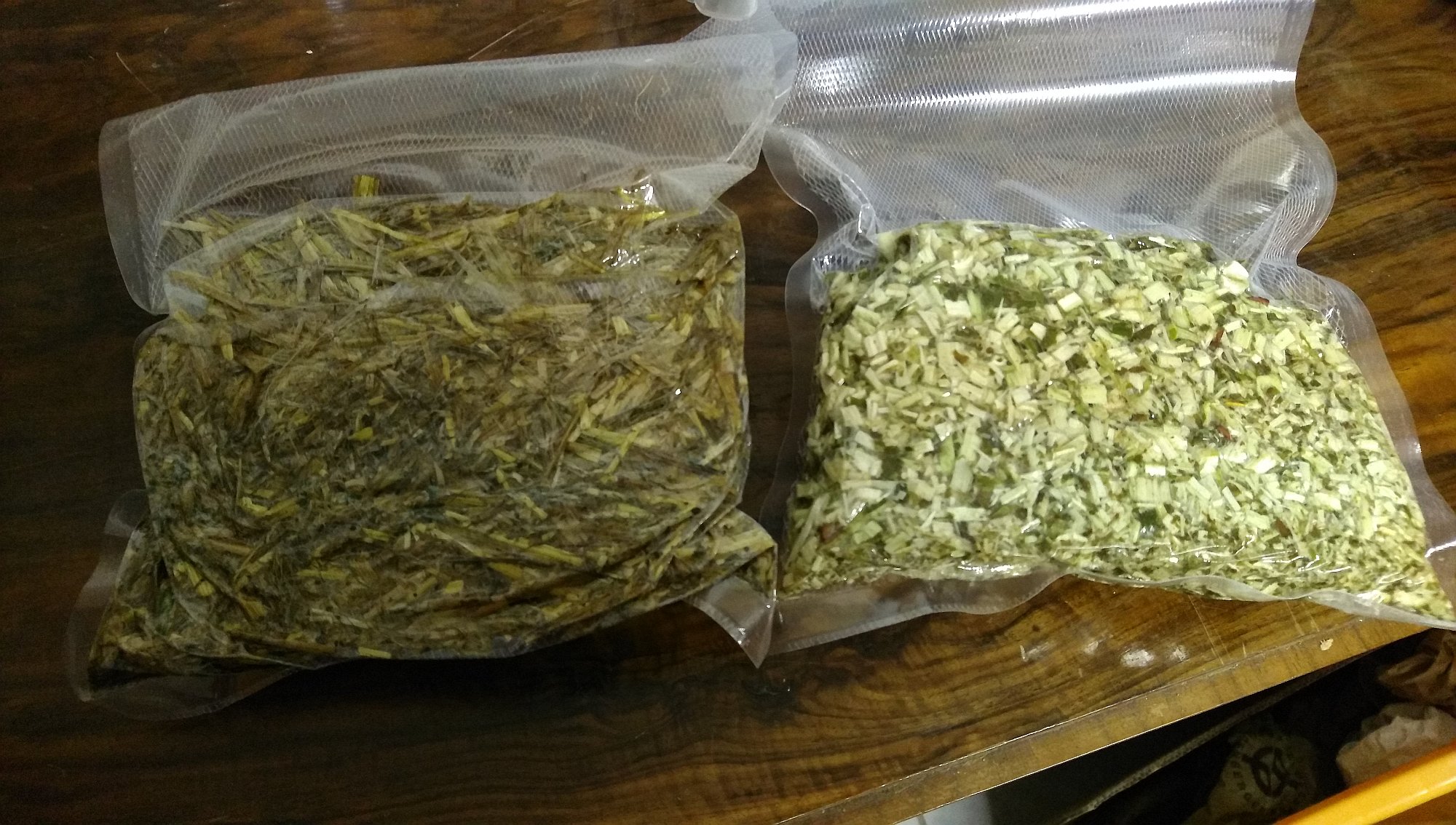 Ich versuche gerade eine relativ trockene fermentation von meinem frischen Weidenholz-Häcksel und gehäckseltem Stroh. Dazu habe ich 90 g Stroh und 200 g Holzhäcksel in je einen Vakuumbeutel gegeben, 120 ml Wasser zum Stroh und 85 ml zum Holz (war frisch, daher ging ich von 35 % feuchte im Holz aus).