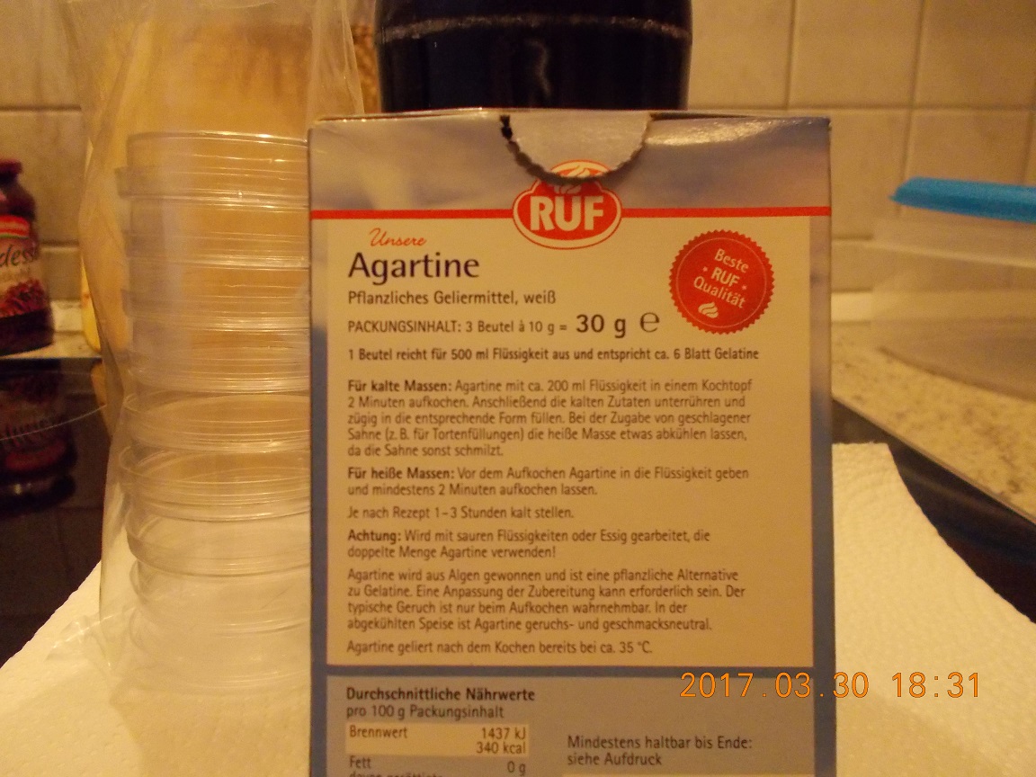 Ich möchte erst mal so anfangen mit Bier/Malz werde ein Schwarzbier nehmen... kochen bis kein Schaum, Alk und Kohlensäure mehr da is... ja auch klar aber nun meine frage richtiges Agar-Agar ist bei mir schwer zu bekommen und über Amazon für 15€ 100g doch sehr teuer.... aber von RUF in K- Land, Pe-nny, Re-we für 0,99€ 30g nennt sich Agartine.