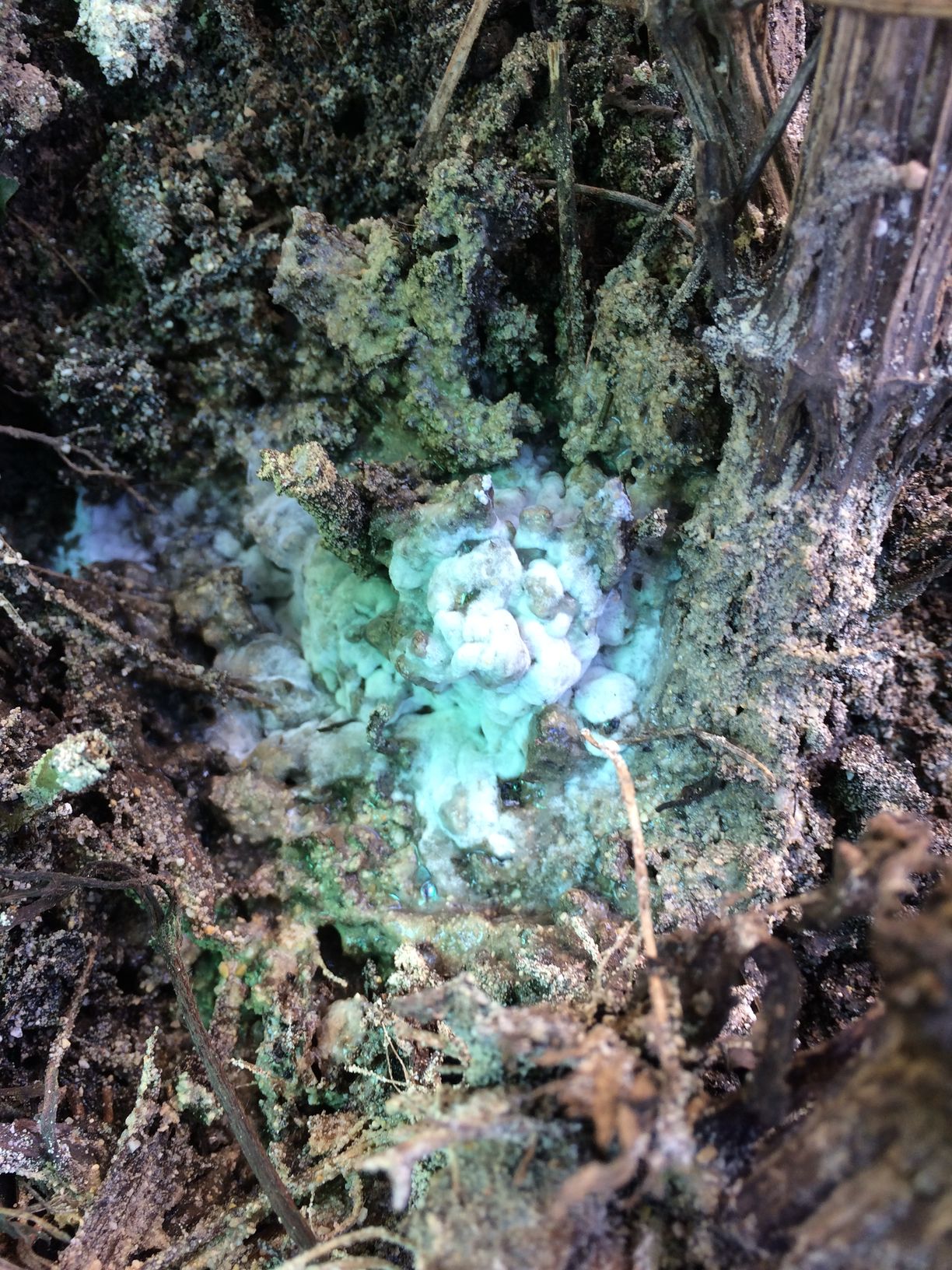 Die Clematis war über den Winter mit Heu abgedeckt und nun hat sich darunter ein weißes, schmieriges Zeug gebildet.