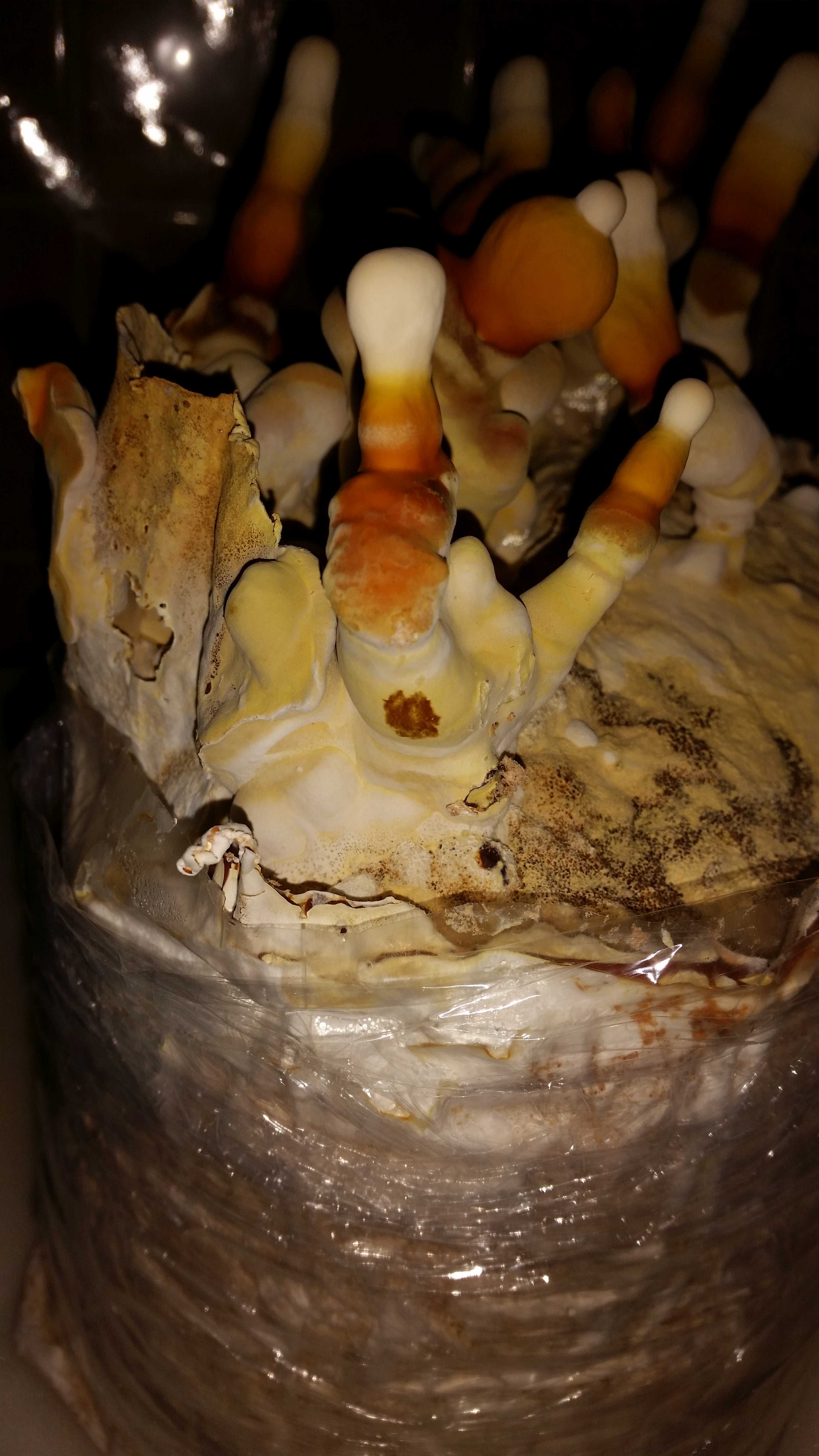 Die zwei verbliebenen Bags gedeihen eigentlich prächtig, wie man an den Fotos sehen kann. Allerdings sieht man, dass sich ein ockerfarbiger Film über die Fruchtkörper zieht, der sich auch schon beim durchwachsen auf der Oberfläche abgezeichnet hat.